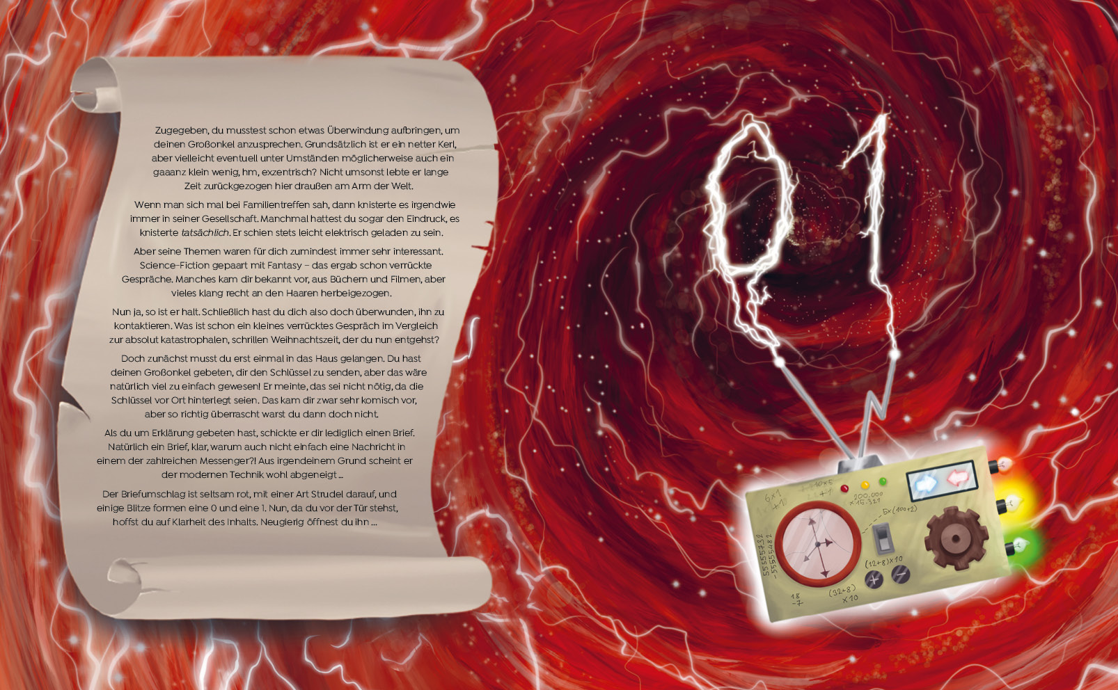 Jedes Jahr ist es das gleiche: Schon ab August stehen die ersten Weihnachtsartikel in den Regalen und schmelzen vor sich hin, Last Christmas schmettert aus dem Radio und der Weihnachtswahnsinn beginnt von Neuem. Aber nicht dieses Jahr! Nicht mit dir. Dein Plan steht fest: Du wirst die Adventszeit in dem alten Haus deines Großonkels weit weg von all dem Trubel verbringen. Doch was als ruhige Auszeit beginnt, entwickelt sich schnell zu einem wahren Abenteuer, als du einen seltsam aussehenden Apparat findest. Wo kommt der denn plötzlich her? Und viel wichtiger: wozu ist der gut? Deine Entdeckung bringt dich auf eine ungeahnte Abenteuerreise in die unterschiedlichsten Epochen der Vergangenheit und möglicherweise sogar die Zukunft ...