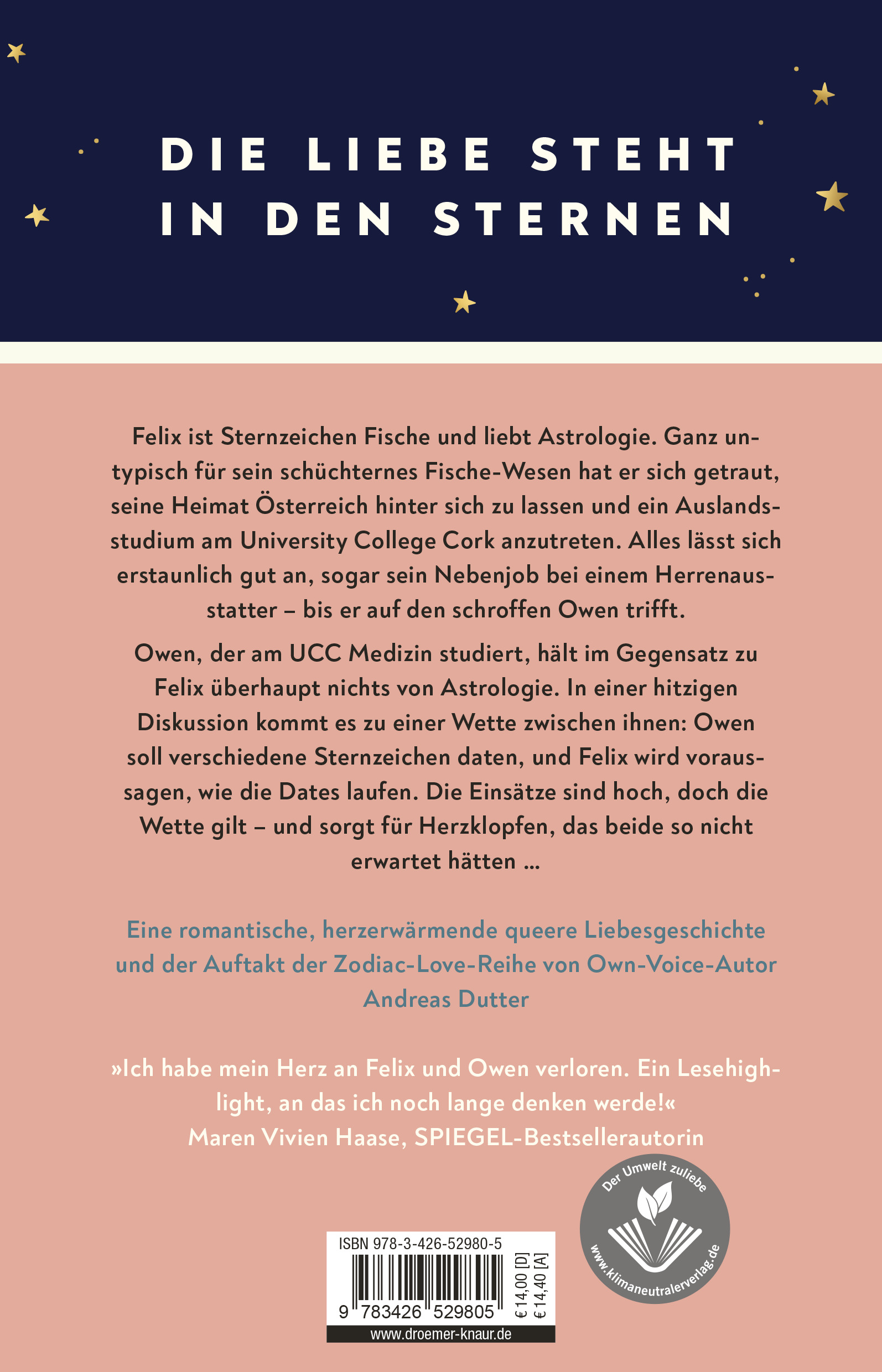 Own-Voice-Autor Andreas Dutter erzählt in seiner Male-Male-Romance eine zum Träumen schöne Liebesgeschichte von den kleinen und großen Hindernissen auf dem Weg zum perfect match. Das Trendthema Astrologie fasziniert ihn schon lange, und daher zieht es sich wie ein rotes Band durch die queeren Liebesgeschichten der New-Adult-Reihe. Im zweiten Band, »Zodiac Love: Hope in Our Universe«, braucht der pansexuelle Quinn die Hilfe der Sterne ...