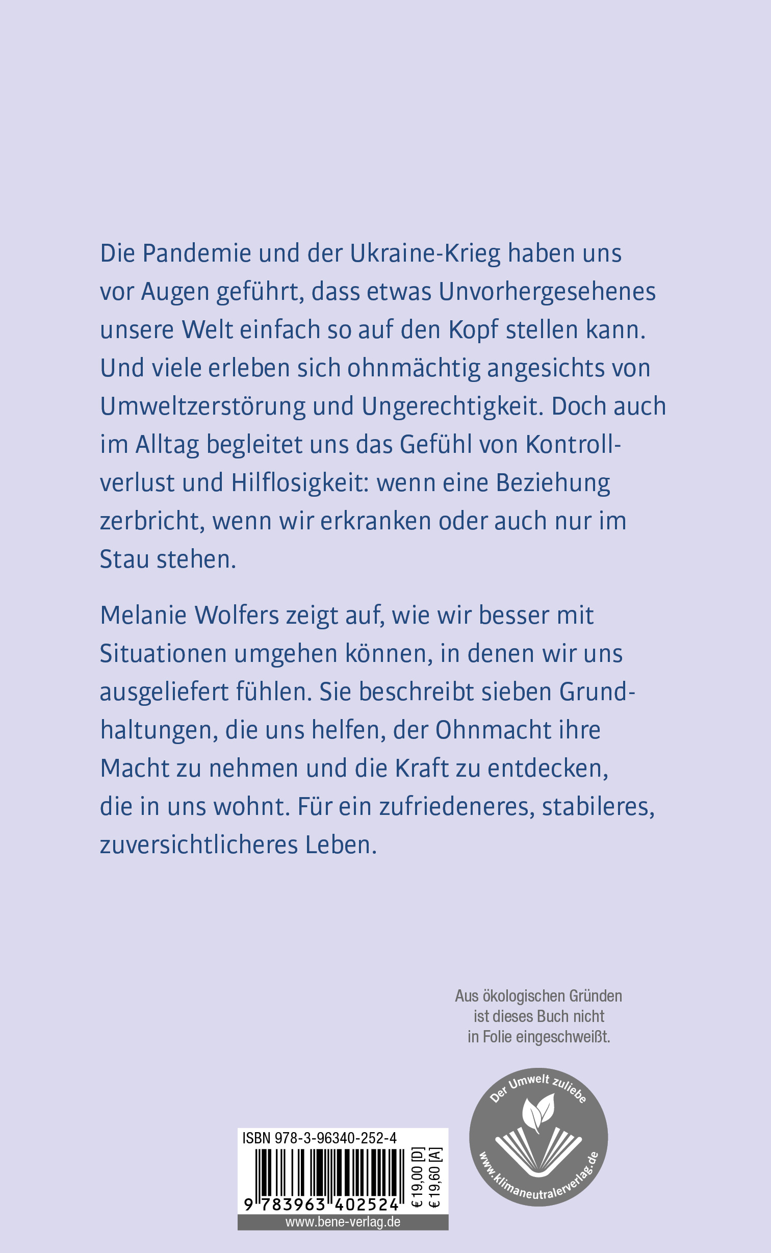 Die Pandemie und der Ukraine-Krieg haben uns vor Augen geführt, dass etwas Unvorhergesehenes unsere Welt einfach so auf den Kopf stellen kann. Und viele erleben sich ohnmächtig angesichts von Umweltzerstörung und Ungerechtigkeit. Doch auch im Alltag begleitet uns das Gefühl von Kontrollverlust und Hilflosigkeit: wenn eine Beziehung zerbricht, wenn wir erkranken oder auch nur im Stau stehen. Melanie Wolfers zeigt auf, wie wir besser mit Situationen umgehen können, in denen wir uns ausgeliefert fühlen. Sie entfaltet sieben Grundhaltungen, die uns helfen, der Ohnmacht ihre Macht zu nehmen und die Kraft zu entdecken, die in uns wohnt. Für ein zufriedenes, stabileres Leben.