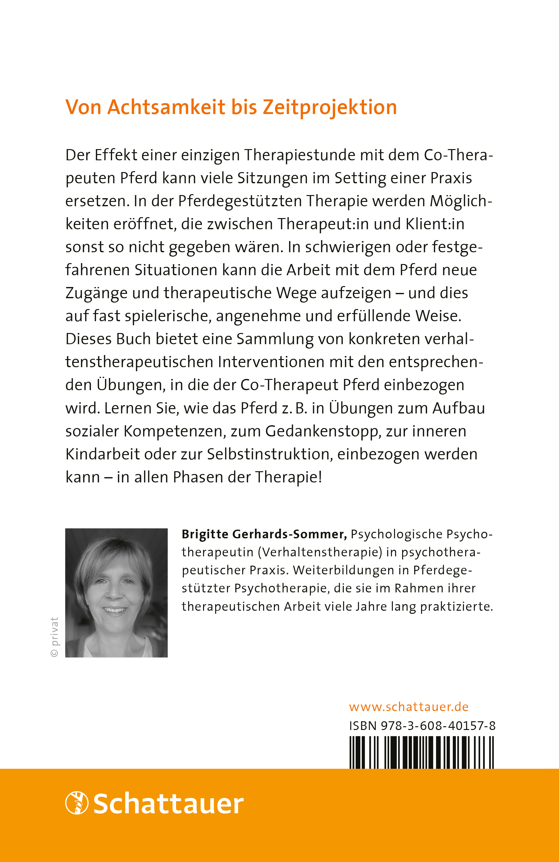 Brigitte Gerhards-Sommer, Psychologische Psychotherapeutin (Verhaltenstherapie) in psychotherapeutischer Praxis. Weiterbildungen in pferdegestützter Psychotherapie, die sie im Rahmen ihrer therapeutischen Arbeit viele Jahre lang praktizierte.