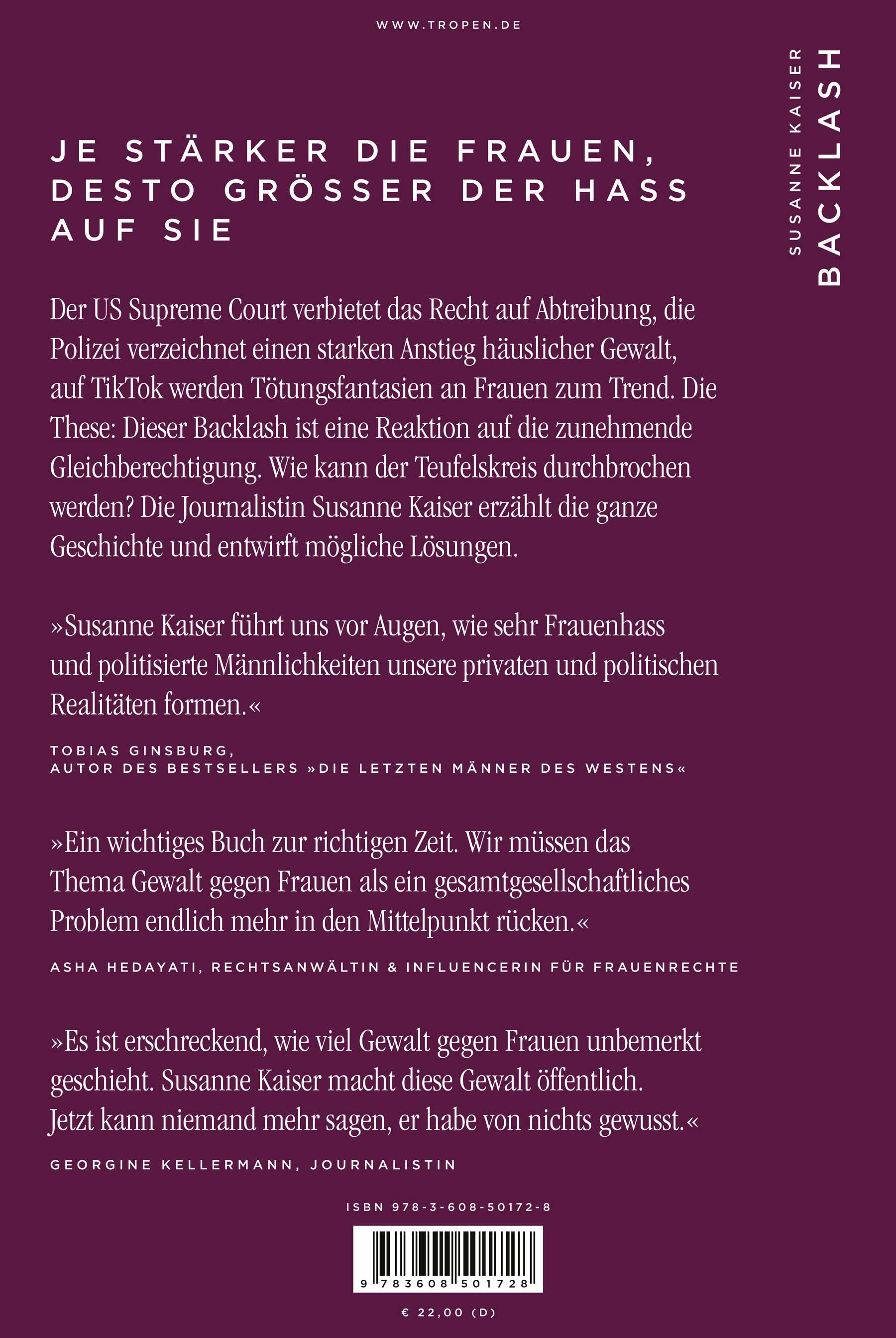 Susanne Kaiser forscht seit über zehn Jahren zum Phänomen des Backlash. Nur wenn es uns gelingt, männlich-weibliche Rollenklischees zu überwinden, werden wir dem Teufelskreis aus Fortschritt und Backlash entkommen. Der Begriff steht für eine forcierte Wiederherstellung antiquierter gesellschaftlicher Regeln und geht zurück auf die Autorin Susan Faludi.
