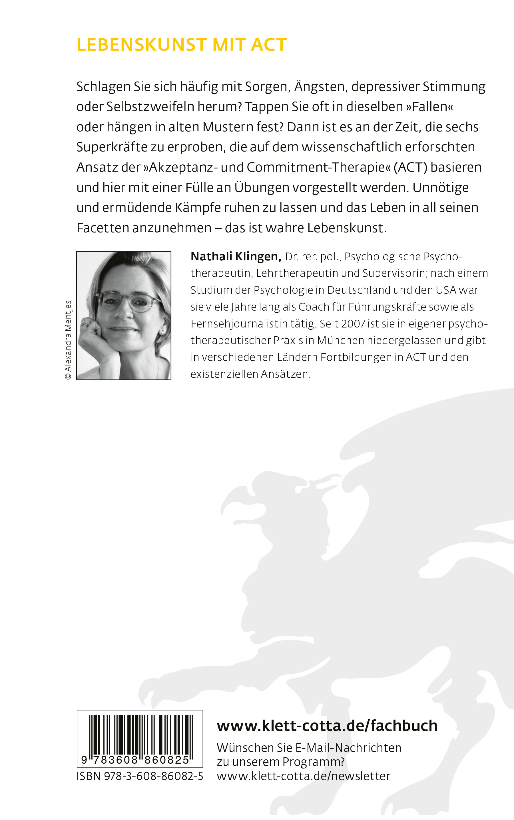 Nathali Klingen, Dr. rer. pol., Psychologische Psychotherapeutin, Lehrtherapeutin und Supervisorin; nach einem Studium der Psychologie in Deutschland und den USA war sie viele Jahre lang als Coach für Führungskräfte sowie als Fernsehjournalistin tätig. Seit 2007 ist sie in eigener psychotherapeutischer Praxis in München niedergelassen und gibt in verschiedenen Ländern Fortbildungen in ACT und den existenziellen Ansätzen.