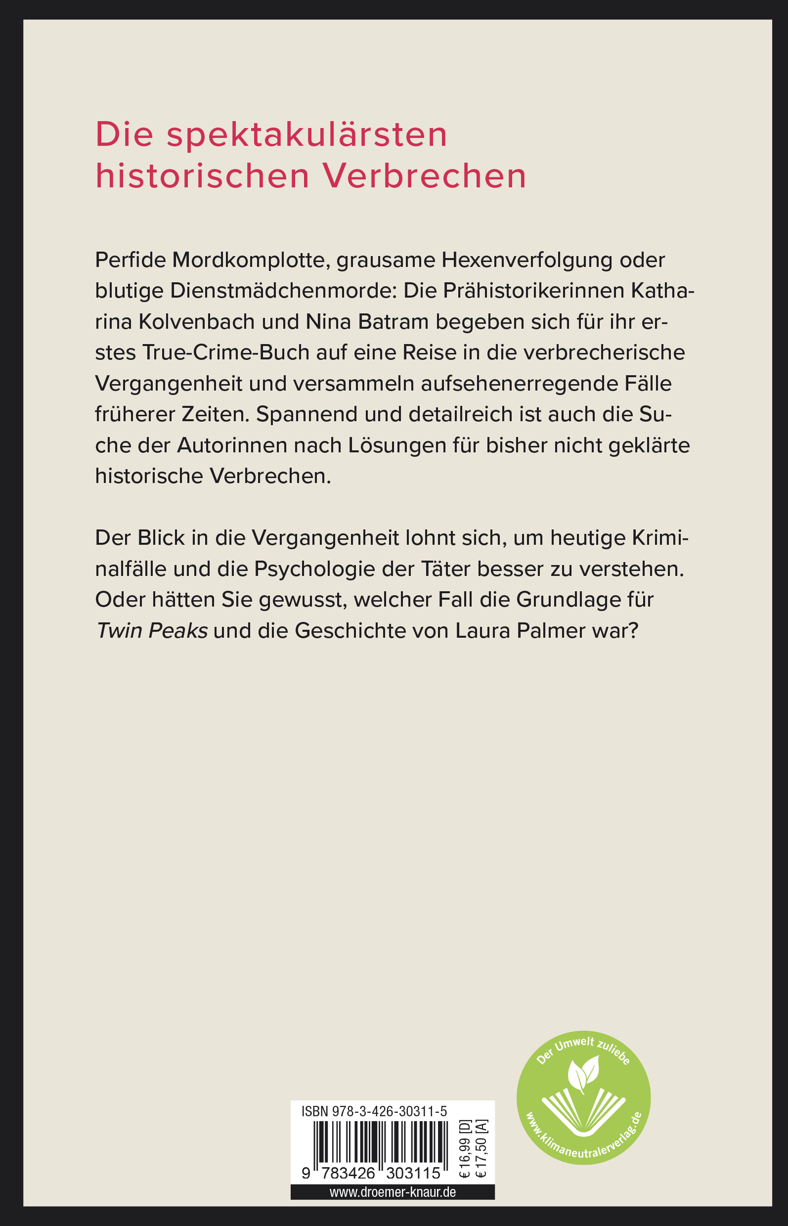 Perfide Mord-Komplotte, grausame Hexen-Verfolgung oder blutige Dienstmädchen-Morde: Die Prähistorikerinnen Nina Batram und Katharina Kolvenbach versammeln in ihrem ersten True-Crime-Buch spektakuläre Fälle, darunter sowohl die besten Folgen aus dem Podcast als auch exklusive historische Kriminalfälle, die noch nicht im Podcast diskutiert wurden. Die Autorinnen berichten von spannenden historischen Verbrechen und deren Hintergründen, skizzieren mögliche Lösungen weit zurückliegender Cold Cases und die Relevanz der Fälle für die heutige Zeit - stets respektvoll, mit viel Empathie und Sachverstand - und immer auch mit einer Prise (Selbst-) Ironie.