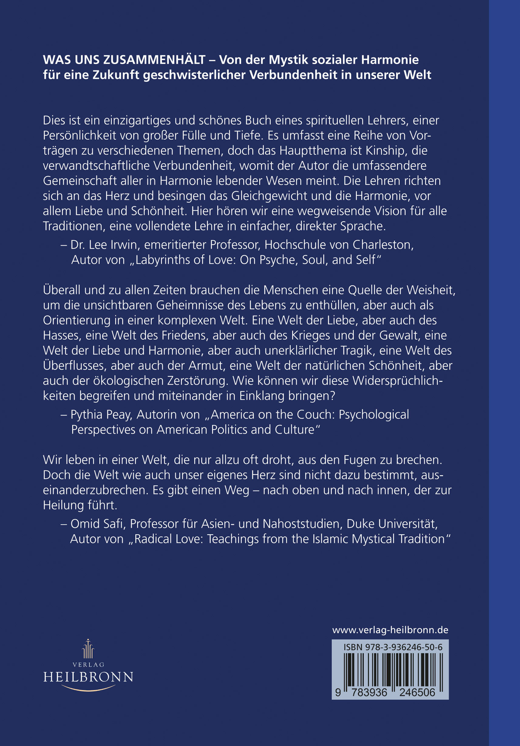 Was uns zusammenhält - Von der Mystik sozialer Harmonie für eine Zukunft geschwisterlicher Verbundenheit in unserer Welt."Dies ist ein einzigartiges und schönes Buch eines spirituellen Lehrers, einer Persönlichkeit von großer Fülle und Tiefe. Es umfasst eine Reihe von Vorträgen zu verschiedenen Themen, doch das Hauptthema ist Kinship, die verwandtschaftliche Verbundenheit, womit der Autor die umfassendere Gemeinschaft aller in Harmonie lebender Wesen meint. Die Lehren richten sich an das Herz und besingen das Gleichgewicht und die Harmonie, vor allem Liebe und Schönheit. Hier hören wir eine wegweisende Vision für alle Traditionen, eine vollendete Lehre in einfacher, direkter Sprache." (Dr. Lee Irwin, emeritierter Professor, Hochschule von Charleston, Autor von "Labyrinths of Love: On Psyche, Soul, and Self")"Überall und zu allen Zeiten brauchen die Menschen eine Quelle der Weisheit, um die unsichtbaren Geheimnisse des Lebens zu enthüllen, aber auch als Orientierung in einer komplexen Welt. Eine Welt der Liebe, aber auch des Hasses, eine Welt des Friedens, aber auch des Krieges und der Gewalt, eine Welt der Liebe und Harmonie, aber auch unerklärlicher Tragik, eine Welt des Überflusses, aber auch der Armut, eine Welt der natürlichen Schönheit, aber auch der ökologischen Zerstörung. Wie können wir diese Widersprüchlichkeiten begreifen und miteinander in Einklang bringen? "(Pythia Peay, Autorin von "America on the Couch: Psychological Perspectives on American Politics and Culture)"Wir leben in einer Welt, die nur allzu oft droht aus den Fugen zu brechen. Doch die Welt wie auch unser eigenes Herz sind nicht dazu bestimmt auseinanderzubrechen. Es gibt einen Weg - nach oben und nach innen, der zur Heilung führt."(Omid Safi, Professor für Asien- und Nahoststudien, Duke Universität, Autor von "Radical Love: Teachings from the Islamic Mystical Tradition")