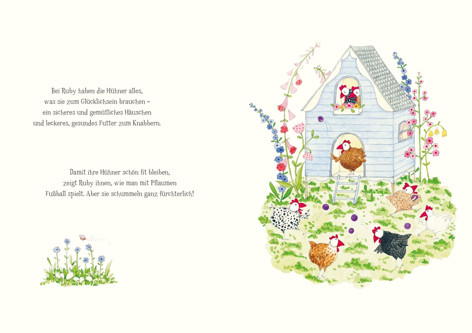 Mit roten Schuhen tanzt es sich leichter durchs Leben. Das Hasenmädchen Ruby hat einen ganzen Schrank voll davon. Und sie hat die allerbeste Oma auf der ganzen Welt! Mit ihr wohnt Ruby in einem bunten Bauwagen, umringt von einem wundervollen Garten. Hier zeigt sich die Liebe der Autorin Kate Knapp zur Natur und all den kleinen Lebewesen, um die sich Ruby jeden Tag kümmert. Ruby mag auch die Ruhe und den Frieden in ihrem Garten. Und wer die Ohren spitzt, kann hier sogar die Blumen wachsen und ihre Hühner Französisch sprechen hören ... Mit viel Charme, Magie und roten Schuhen hat Ruby bereits die Herzen der Kinder in aller Welt erobert. In dieses bezaubernde Hasenmädchen muss man sich einfach verlieben! Nun erscheint der internationale Bestseller auch in Deutschland.