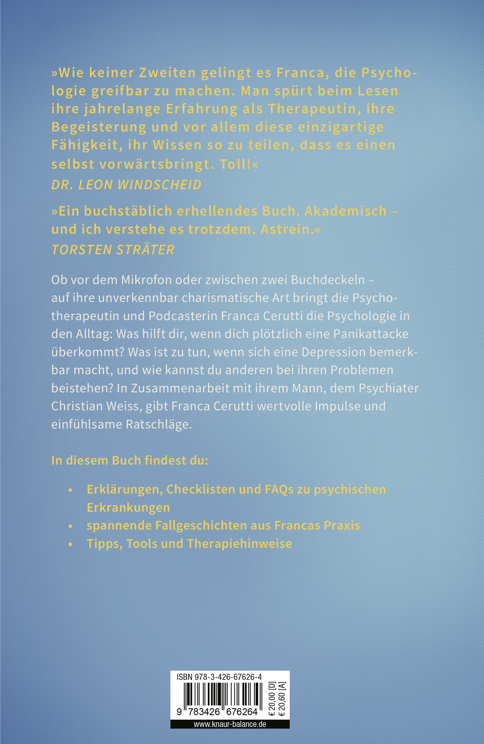 Franca Cerutti klärt dich über die drei verbreitetsten psychischen Erkrankungen Angststörungen, Depression, und Sucht auf. Du erfährst alles darüber, was da in deinem Körper eigentlich genau passiert, wenn sich ein psychisches Leiden einstellt. Zudem gibt dir die Autorin dank praktischen Checklisten, Fragebögen, anregenden Fallgeschichten aus ihrer Praxis und konkreten Ratschlägen Hilfestellung. Was kannst du tun, wenn dich eine Panikattacke überkommt? Wie kannst du deinen Liebsten bei ihren Problemen beistehen und was hilft dir, wenn sich eine Depression bemerkbar macht? Zu all dem und viel mehr nimmt Franca Cerutti kein Blatt vor den Mund und ist nicht nur kompetent, sondern auch einfach herrlich sympathisch.