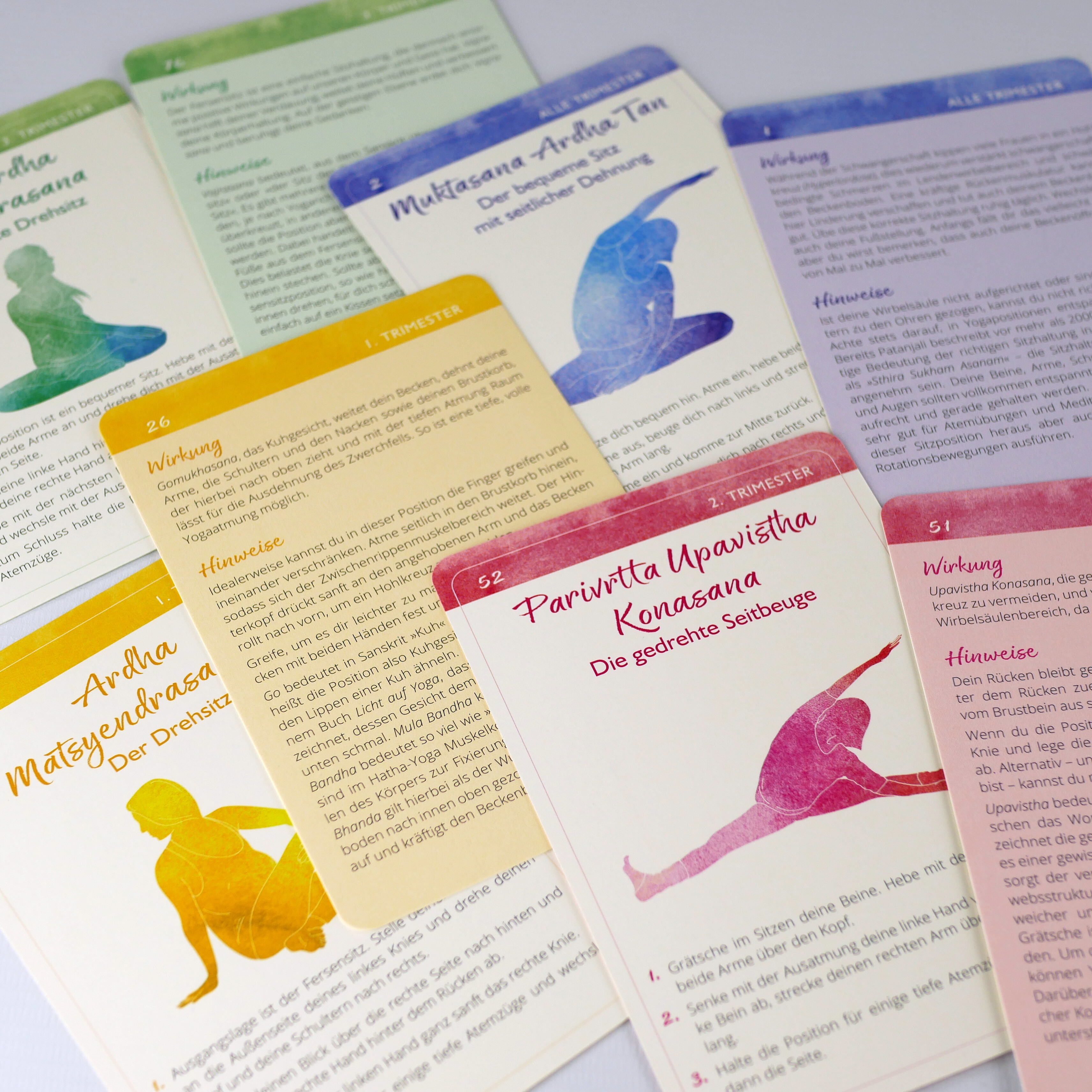 Die 100 in Trimester gegliederten Übungskarten und lassen sich frei kombinieren, damit du ganz einfach individuelle Sequenzen erstellen kannst, die genau zu deinen Bedürfnissen passen. Zudem findest du im beiliegenden Booklet Anregungen zu Flows gegen die häufigsten Beschwerden wie