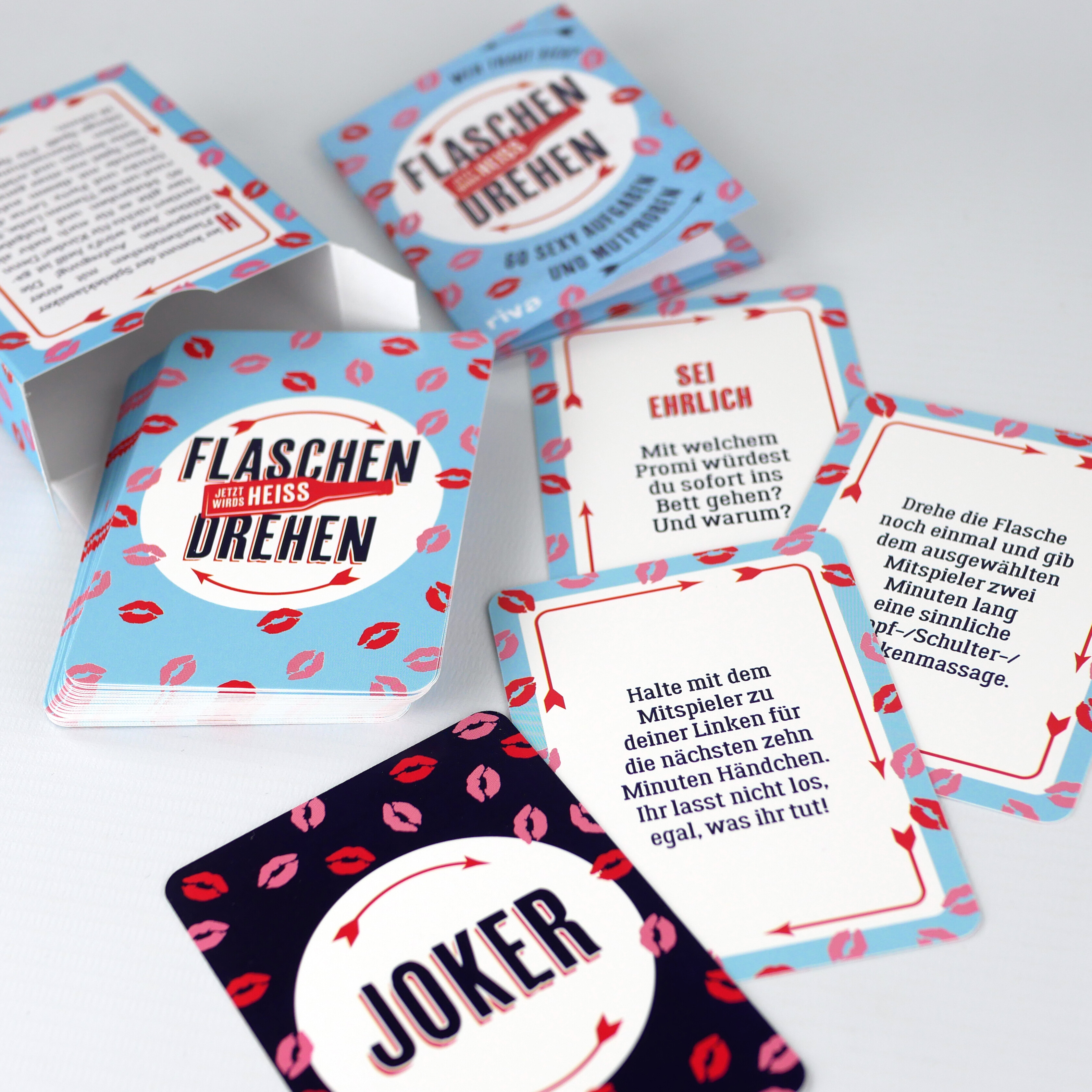 Hier kommt der Spieleklassiker Flaschendrehen mit einer Extraportion Aufregung! Die Edition Jetzt wird s heiß ist garantiert nichts für Kinder! Denn hier gibt es für euch mehr als 60 Mutproben und Aufgaben rund um die Themen Liebe, Sex, Drinks und Party. Lerne deine Freunde mit diesem aufregenden Spiel von einer ganz neuen Seite kennen und erlebe neben vielen Überraschungen jede Menge Spaß!