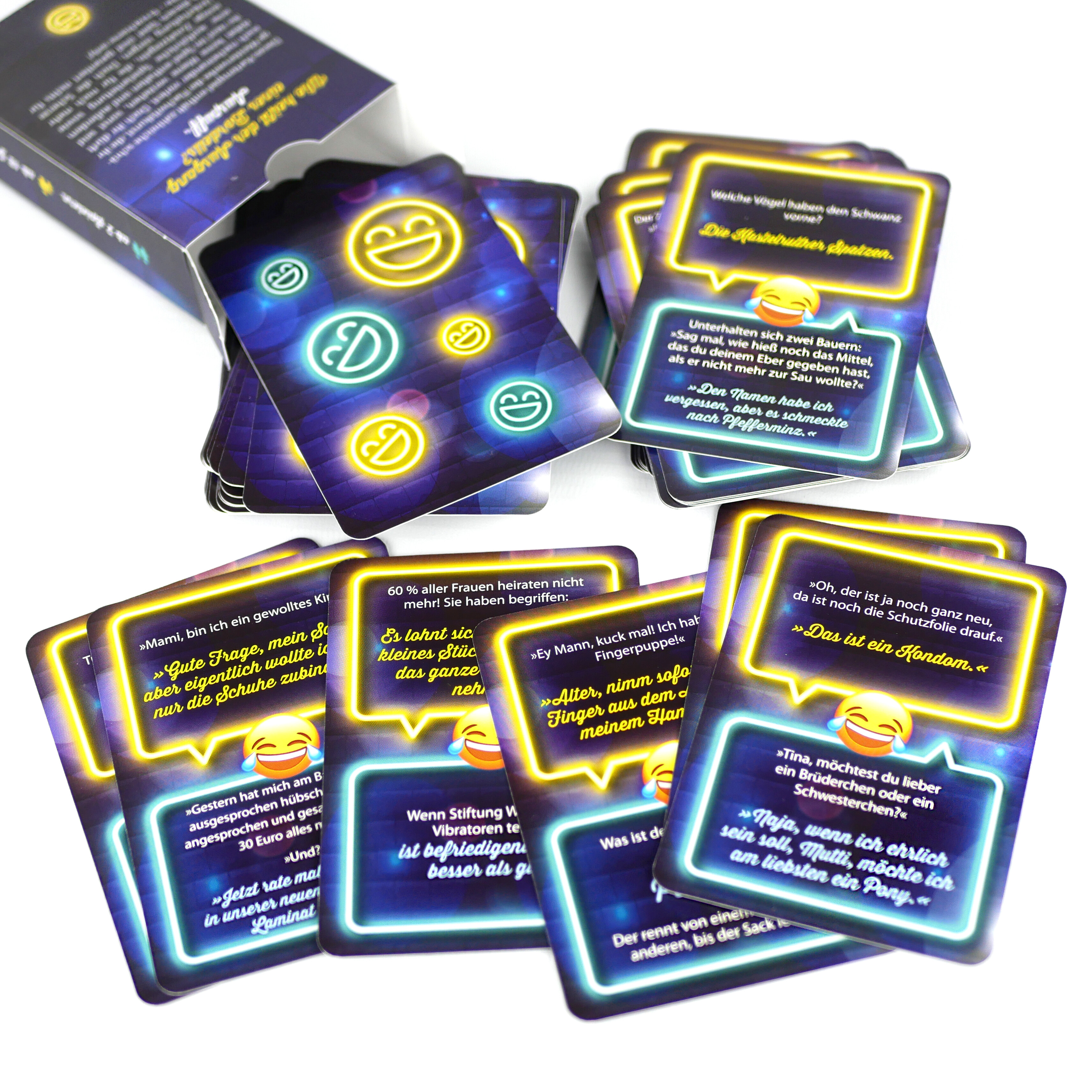| Schlagworte | challenge • Flachwitze • Geburtstag • Geschenk • Humor • Karten • Konzentration • Last one laughing • lol • lustig • Mitbringsel • Party • Partyspiel • Spaß • Spiel • Spieleabend • Trinkspiel • versaute Witze • Weihnachten |