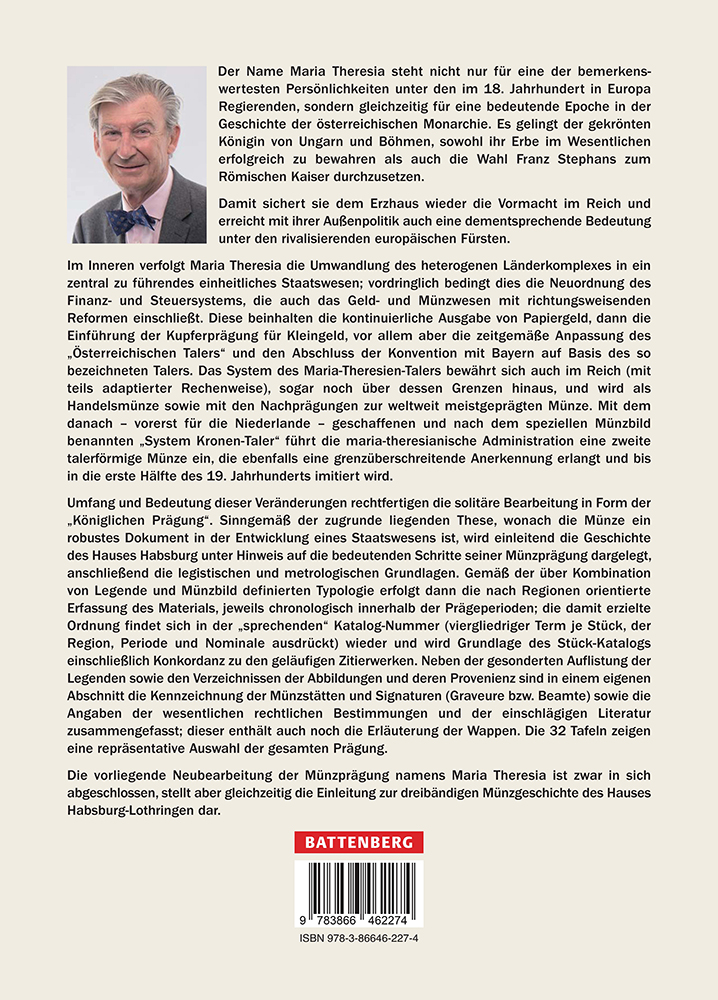 Der Name Maria Theresia steht nicht nur für eine der bemerkenswertesten Persönlichkeiten unter den im 18. Jahrhundert in Europa Regierenden, sondern gleichzeitig für eine bedeutende Epoche in der Geschichte der österreichischen Monarchie. Es gelingt der gekrönten Königin von Ungarn und Böhmen, sowohl ihr Erbe im Wesentlichen erfolgreich zu bewahren als auch die Wahl Franz Stephans zum Römischen Kaiser durchzusetzen. Damit sichert sie dem Erzhaus wieder die Vormacht im Reich und erreicht mit ihrer Außenpolitik auch eine dementsprechende Bedeutung unter den rivalisierenden europäischen Fürsten.Im Inneren verfolgt Maria Theresia die Umwandlung des heterogenen Länderkomplexes in ein zentral zu führendes einheitliches Staatswesen; vordringlich bedingt dies die Neuordnung des Finanz- und Steuersystems, die auch das Geld- und Münzwesen mit richtungsweisenden Reformen einschließt. Diese beinhalten die kontinuierliche Ausgabe von Papiergeld, dann die Einführung der Kupferprägung für Kleingeld, vor allem aber die zeitgemäße Anpassung des "Österreichischen Talers" und den Abschluss der Konvention mit Bayern auf Basis des so bezeichneten Talers. Das System des Maria-Theresien-Talers bewährt sich auch im Reich (mit teils adaptierter Rechenweise), sogar noch über dessen Grenzen hinaus, und wird als Handelsmünze sowie mit den Nachprägungen zur weltweit meistgeprägten Münze. Mit dem danach - vorerst für die Niederlande - geschaffenen und nach dem speziellen Münzbild benannten "System Kronen-Taler" führt die maria-theresianische Administration eine zweite talerförmige Münze ein, die ebenfalls eine grenzüberschreitende Anerkennung erlangt und bis in die erste Hälfte des 19. Jahrhunderts imitiert wird.Umfang und Bedeutung dieser Veränderungen rechtfertigen die solitäre Bearbeitung in Form der "Königlichen Prägung". Sinngemäß der zugrunde liegenden These, wonach die Münze ein robustes Dokument in der Entwicklung eines Staatswesens ist, wird einleitend die Geschichte des Hauses Habsburg unter Hinweis auf die bedeutenden Schritte seiner Münzprägung dargelegt, anschließend die legistischen und metrologischen Grundlagen. Gemäß der über Kombination von Legende und Münzbild definierten Typologie erfolgt dann die nach Regionen orientierte Erfassung des Materials, jeweils chronologisch innerhalb der Prägeperioden; die damit erzielte Ordnung findet sich in der "sprechenden" Katalog-Nummer (viergliedriger Term je Stück, der Region, Periode und Nominale ausdrückt) wieder und wird Grundlage des Stück-Katalogs einschließlich Konkordanz zu den geläufigen Zitierwerken. Neben der gesonderten Auflistung der Legenden sowie den Verzeichnissen der Abbildungen und deren Provenienz sind in einem eigenen Abschnitt die Kennzeichnung der Münzstätten und Signaturen (Graveure bzw. Beamte) sowie die Angaben der wesentlichen rechtlichen Bestimmungen und der einschlägigen Literatur zusammengefasst; dieser enthält auch noch die Erläuterung der Wappen. Die 32 Tafeln zeigen eine repräsentative Auswahl der gesamten Prägung. Die vorliegende Neubearbeitung der Münzprägung namens Maria Theresia ist zwar in sich abgeschlossen, stellt aber gleichzeitig die Einleitung zur dreibändigen Münzgeschichte des Hauses Habsburg-Lothringen dar.