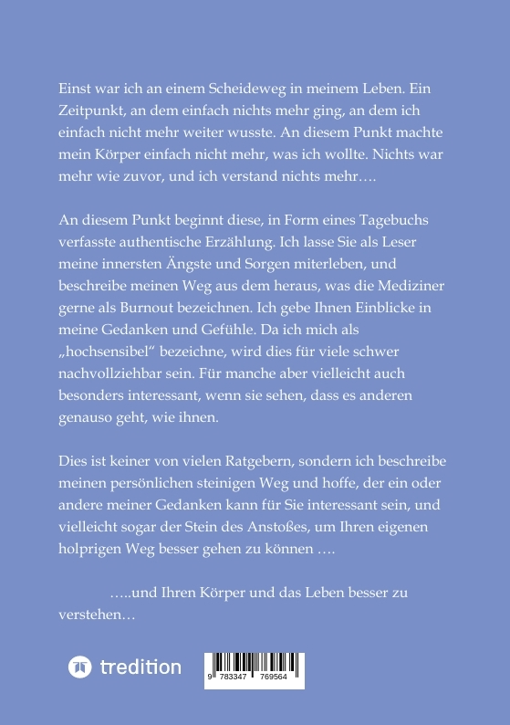 Dieses in Tagebuchform geschriebene Buch beschreibt meine Erfahrungen mit dem, was der Mediziner heutzutage als Burnout bezeichnet. In sehr persönlich und emotional geschriebenen Kapiteln beschreibe ich, als hochsensibler Mann, dem Leser meine tiefgehenden Sorgen, Gedanken und Lösungsansätze, die mich auf meinem steinigen Weg begleitet haben.