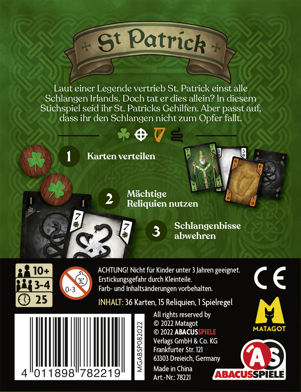 Laut einer Legende vertrieb St. Patrick einst alle Schlangen Irlands. Doch tat er dies allein? In diesem Stichspiel seid ihr St. Patricks Gehilfen. Aber passt auf, dass ihr den Schlangen nicht zum Opfer fallt.