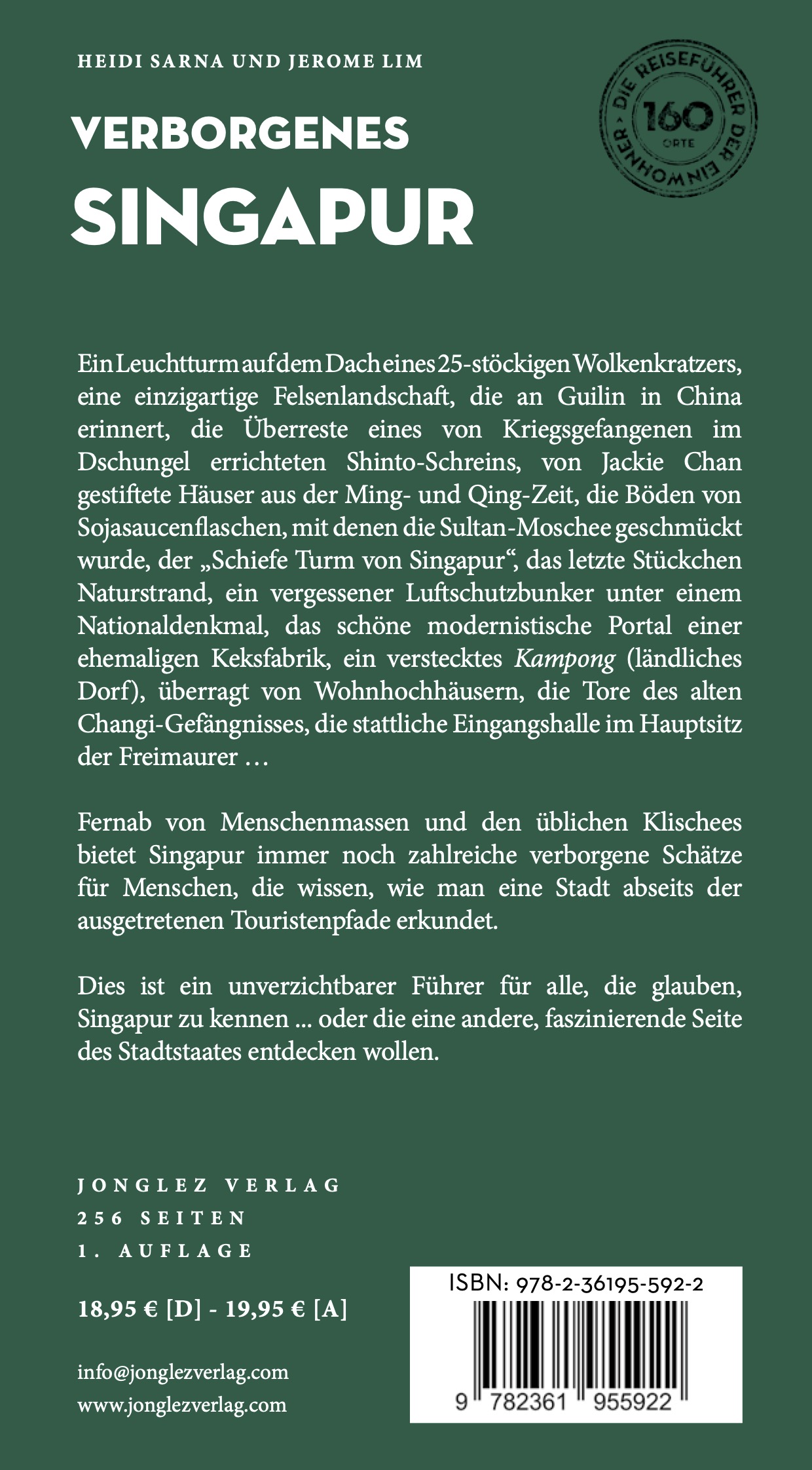 Ein Leuchtturm auf dem Dach eines 25-stöckigen Wolkenkratzers, eine einzigartige Felsenlandschaft, die an Guilin in China erinnert, die Überreste eines von Kriegsgefangenen im Dschungel errichteten Shinto Schreins, von Jackie Chan gestiftete Häuser aus der Ming- und Qing-Zeit, die Böden von Sojasaucenflaschen, mit denen die Sultan-Moschee geschmückt wurde, der „Schiefe Turm von Singapur“, das letzte Stückchen Naturstrand, ein vergessener Luftschutzbunker unter einem Nationaldenkmal, das schöne modernistische Portal einer ehemaligen Keksfabrik, ein verstecktes Kampong (ländliches Dorf), überragt von Wohnhochhäusern, die Tore des alten Changi-Gefängnisses, die stattliche Eingangshalle im Hauptsitz der Freimaurer …