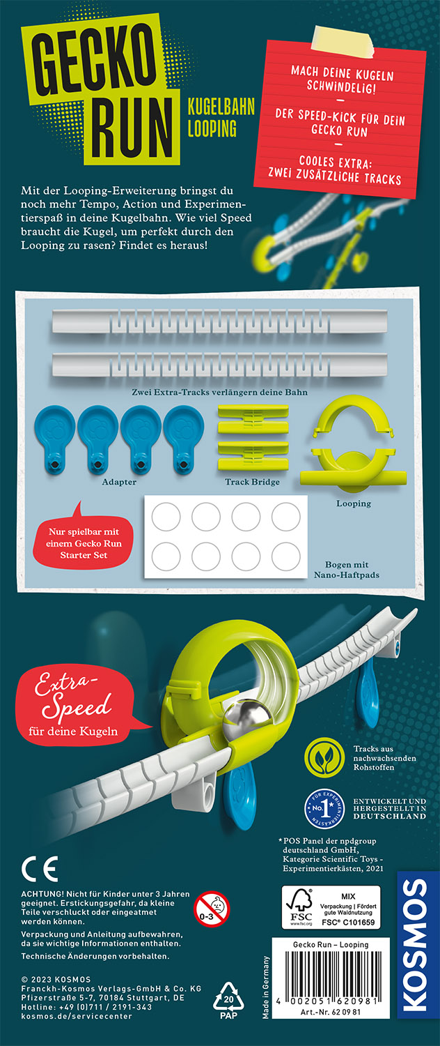 Kopfüber in den Kugel-Wahnsinn: Mit dem Looping startet die nächste Challenge von Gecko Run. Wie viel Speed braucht die Kugel, damit sie den Stunt meistert? Und in welchem Winkel startet sie am besten in den Looping? Nur wer selber tüftelt wird zum Meister! Mit den zusätzlichen Bahn-Elementen aus biobasiertem Kunststoff erweitert sich die Reichweite der Kugelbahn, sodass an noch mehr Fliesen, Glasscheiben, Regalen und anderen Oberflächen gebaut werden kann. Nach ersten Tipps in der Anleitung kann nach Lust und Laune mit dem Looping experimentiert werden. Gecko Run wird mit Karacho erweitert: Der Looping von KOSMOS bietet Kindern ab 8 Jahren noch mehr Möglichkeiten, ihre Kugelbahn zu gestalten. Hinweis: nur mit dem Gecko Run "Starter Set" spielbar. Mit der Looping-Erweiterung geht's kopfüber weiter: Wie viel Speed braucht die Kugel, damit sie den Stunt meistert? Und in welchem Winkel startet sie am besten in den Looping? Erste Tipps gibt es in der Anleitung, aber nur wer selber tüftelt wird zum Meister! Jede kleine Veränderung startet ein neues Kugel-Abenteuer! Das tolle Extra: Zusätzliche Bahn-Elemente aus biobasiertem Kunststoff vergrößern die Reichweite der Kugelbahn! Hinweis: nur mit dem Gecko Run "Starter Set" spielbar.