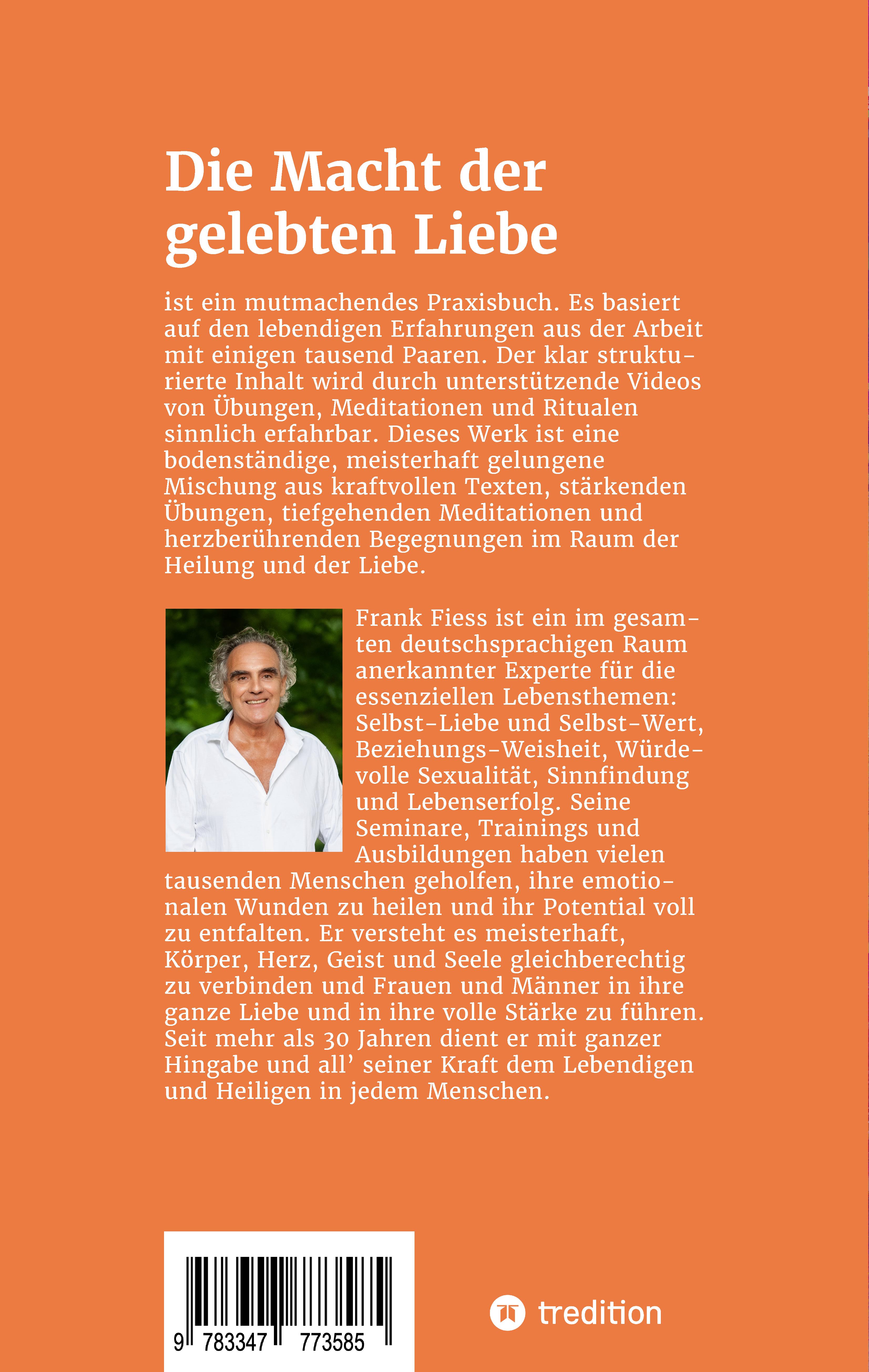 Frank Fiess ist Diplom-Pädagoge, Heilpraktiker für Psychotherapie, Therapeut für Integrative Körperpsychotherapie (IKPT) und EMDR. Seit vielen Jahren arbeitet er als Tantra-, Yoga- und Feuerlauf-Lehrer. Für mehr als 20000 Menschen war er bisher ein inspirierender, begeisternder und kompetenter Lehrer und Wegbegleiter. Wichtige Stationen auf seinem Weg, waren die Arbeit am Frank Natale Institut, die Gründung des Instituts für Lebenskunst – das er 23 Jahre gemeinsam mit Michaele Kuhn leitete – und seit 2013 der Aufbau seines eigenen Instituts. Die Herzensthemen und brennenden Anliegen in seiner Arbeit sind vor allem: Die 3-jährige Ausbildung Liebe & Erfolg/IKPT, in der er die Schätze seiner mittlerweile mehr als 30-jährigen Arbeit konzentriert hat. Das Training IM KREIS DER MÄNNER, das bisher einige Tausend Männer im Alter von 18-78 Jahren besucht haben. Die Rückenstärkung für Paare in seinem Paar-Training „Zeit für die Liebe“. Intensiv-Seminare an Silvester, Ostern und im Sommer auf Korfu zu besonderen Themen. Er ist ein Praktiker, der es versteht, Menschen wieder tiefer mit dem Geschenk ihres Lebens und ihrer Lebendigkeit zu verbinden. Tägliche Übungen und tägliche Praxis sind für ihn der Boden auf dem wirkliche Entwicklung und substanzielles Wachstum gedeihen. Die Erfahrung der eigenen Wirksamkeit und die Entwicklung der eigenen Liebesfähigkeit sind Kerninhalte seiner Seminare. Spirituelles Wachstum, gesellschaftliches Engagement und Liebe zu den Menschen, Tieren, Pflanzen und für die Erde sind für ihn eins. Webseite des Autors: www.frankfiess.de