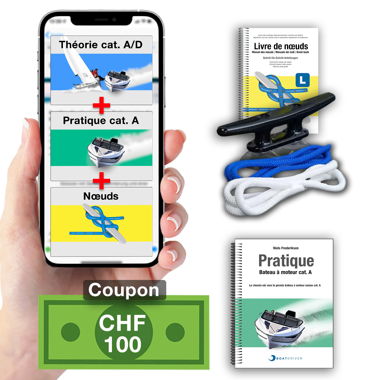 Grâce au coupon à une valeur jusqu'à CHF 100.—, tu économises de l'argent pour la formation pratique, utilisable dans de nombreuses écoles de conduite de bateaux dans toute la Suisse.