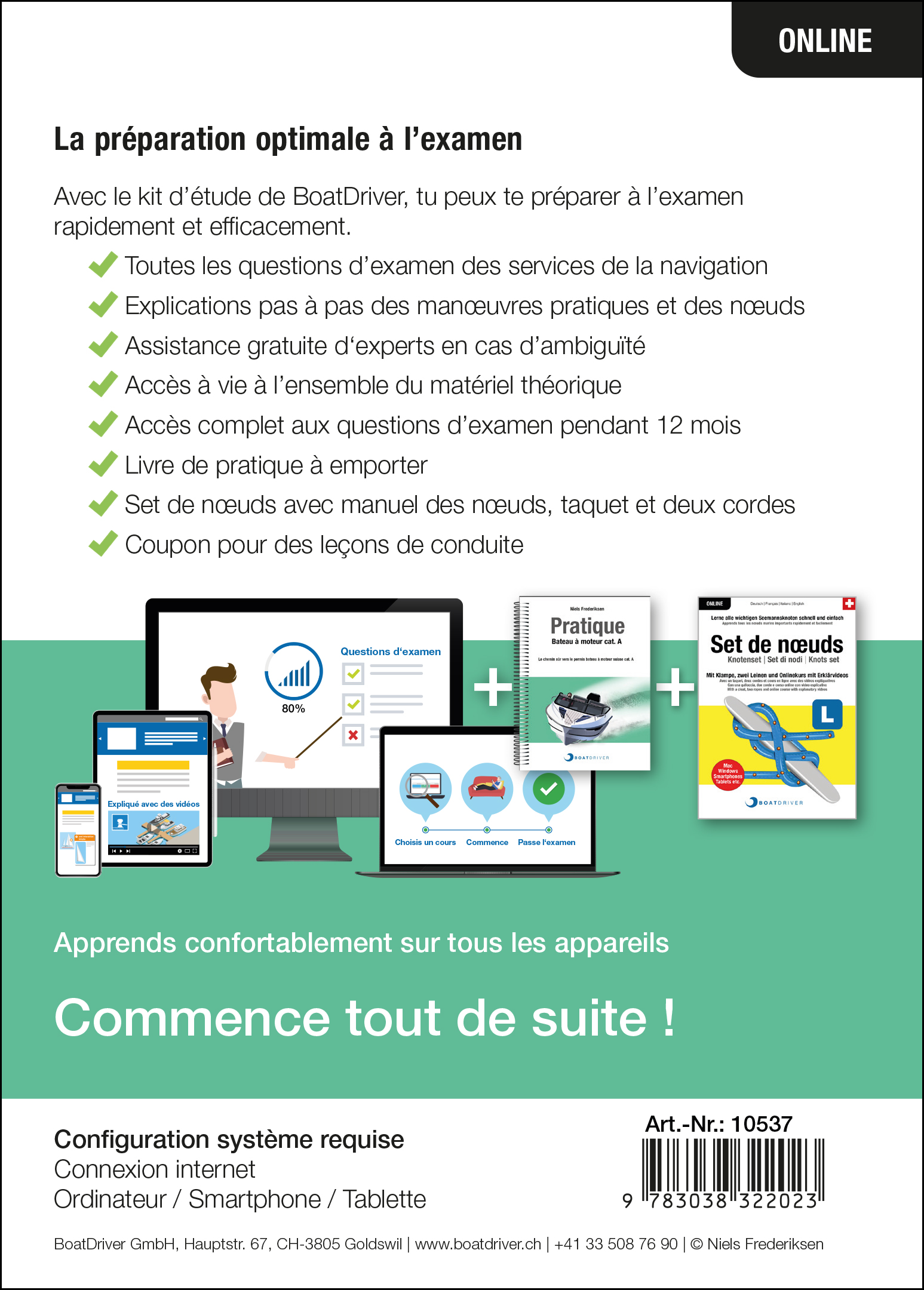 Les manœuvres d'examen te sont présentées sous forme d'instructions pas à pas. D'autres thèmes comme la sécurité maritime, le matelotage, etc. te sont expliqués.