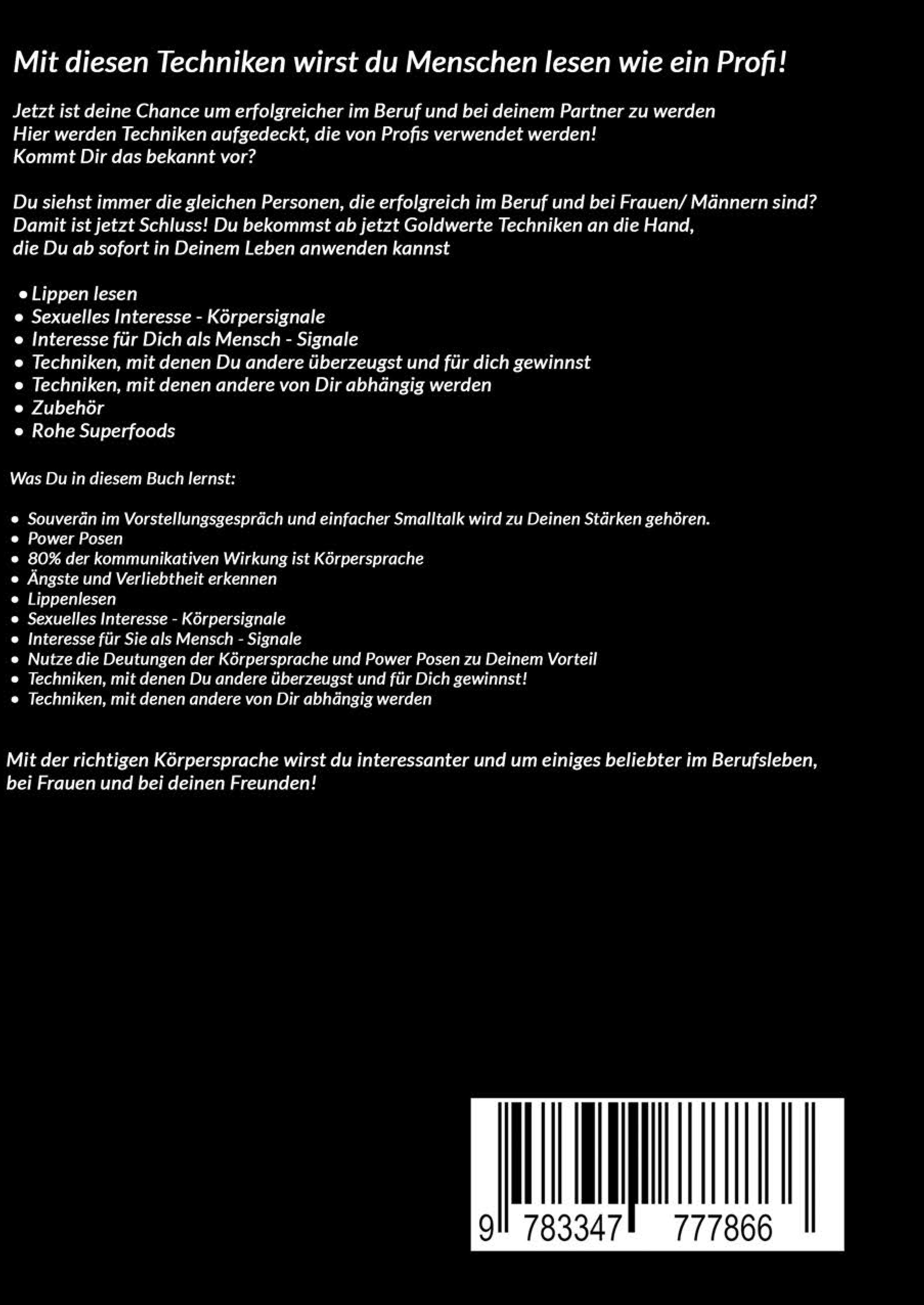 KÖRPERSPRACHE TECHNIKEN: Mit diesen Techniken lernst Du Menschen lesen wie ein Profi!SEI ERFOLGREICHER MIT KÖRPERSPRACHE TECHNIKENMund ist zu, der Körper spricht!Du suchst effektive Techniken, um im Berufsleben und bei der Partnersuche charmant erfolgreicher zu werden?Mit diesen Techniken bekommst Du jede Frau/MannHier werden Techniken aufgedeckt, die von Profis verwendet werden!Kommt Dir das bekannt vor?Du siehst immer die gleichen Personen, die erfolgreich im Beruf und bei Frauen/ Männern sind? Damit ist jetzt Schuss! Du bekommst nun goldwerte Techniken an die Hand, die Du ab sofort in Deinem Leben anwenden kannst. Was Du in diesem Buch lernst: Smalltalk wird zu Deinen Stärken gehören. Power Posen 80% der kommunikativen Wirkung ist Körpersprache Ängste und Verliebtheit erkennen Lippen lesen Sexuelles Interesse - Körpersignale Interesse für Dich als Mensch - Signale Nutze die Körpersprache, Deutungen und Power Posen zu Deinem Vorteil Techniken, mit denen Du andere überzeugst und für dich gewinnst! Techniken, mit denen andere von Dir abhängig werdenDiese GEHEIMEN und ultra-starken TECHNIKEN wurden in Studien und von professionellen Speakern als erfolgreich nachgewiesen!Für wen dieses Buch nichts ist? Personen, die glauben, dass sie alles erreicht haben. Personen, die von sich glauben, dass Sie alles kennen und wissen.Wie Du dieses Buch lesen kannst?- Mit der kostenlosen Kindle-App für eBooks kannst Du dieses eBook auch ohne Kindle-Reader auf Deinem PC, Smartphone oder Tablet lesen.100% Geld-Zurück-Garantie!- Wenn Du mit dem Buch nicht zufrieden sein solltest, dann kannst Du es innerhalb von 7 Tagen an Amazon zurückgeben und bekommst den vollen Kaufpreis erstattet. - Dein Risiko ist gleich Null.Ein wichtiger Hinweis zum Taschenbuch. Das Taschenbuch wird in schwarzweiß gedruckt. Die Bilder im Taschenbuch müssen leider verkleinert werden. Da sich die Kosten des Buches sonst ca. vervierfachen würden. Als Ausgleich bekommst Du das eBook gratis in Farbe und bester Bildqualität dazu.Scrolle nach oben und klicke auf den "JETZT KAUFEN" Button!