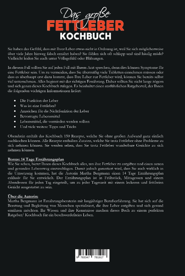 "Das große Fettleber Kochbuch" ist Ihr umfassender Leitfaden, um den Herausforderungen einer Fettleber mit einer gesunden und angepassten Ernährung zu begegnen. Wenn Sie sich oft schlapp und müde fühlen oder Symptome wie Völlegefühl und Blähungen erleben, könnte dieses Buch ein entscheidender Schritt in Richtung eines gesünderen Lebensstils sein.Martha Bergmann, die Autorin dieses Buches, bietet Ihnen nicht nur eine Sammlung von 150 einfach zuzubereitenden Rezepten, sondern auch einen wertvollen Ratgeberteil. Dieser Teil des Buches erklärt Ihnen umfassend die Funktion der Leber, was eine Fettleber ist, wie man sie erkennt, und gibt Ihnen wichtige Tipps zu bevorzugten Lebensmitteln sowie zu solchen, die vermieden werden sollten.Die Rezepte in diesem Buch sind sorgfältig ausgewählt, um Ihre Leber zu entlasten und zu entgiften, ohne dabei auf Geschmack und Vielfalt verzichten zu müssen. Sie werden entdecken, dass eine leberfreundliche Ernährung abwechslungsreich und genussvoll sein kann, und dass Sie trotz der Diätbeschränkungen köstliche Mahlzeiten genießen können.Ein besonderes Highlight ist der 14-Tage-Ernährungsplan, den Martha Bergmann exklusiv für Sie zusammengestellt hat. Dieser Plan erleichtert Ihnen den Einstieg in eine leberfreundliche Ernährung und hilft Ihnen, die neuen Ernährungsgewohnheiten in Ihren Alltag zu integrieren. Jeder Tag des Plans bietet ausgewogene Mahlzeiten für Frühstück, Mittag- und Abendessen."Das große Fettleber Kochbuch" ist mehr als nur ein Rezeptbuch; es ist ein umfassender Ratgeber, der Ihnen zeigt, wie Sie durch die richtige Ernährung Ihre Lebergesundheit verbessern und einen neuen, gesunden Lebensweg einschlagen können. Warten Sie nicht länger, ergreifen Sie jetzt die Initiative für Ihre Gesundheit und Ihr Wohlbefinden. Sichern Sie sich Ihr Exemplar des "Großen Fettleber Kochbuchs" und starten Sie in ein leberfreundliches, gesünderes Leben.