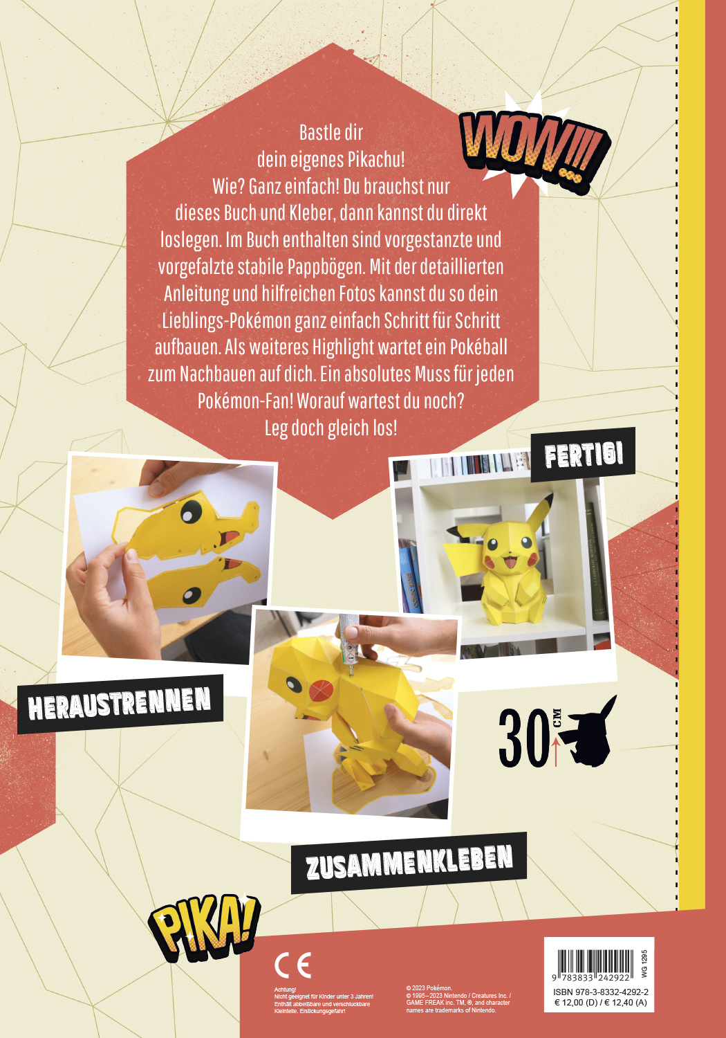 Bastle dir dein eigenes Pikachu! Wie? Ganz einfach! Du brauchst nur dieses Buch und Kleber, dann kannst du direkt loslegen. Im Buch enthalten sind vorgestanzte und vorgefalzte stabile Pappbögen. Mit der detaillierten Anleitung und hilfreichen Fotos kannst du so dein Lieblings-Pokémon ganz einfach Schritt für Schritt aufbauen. Als weiteres Highlight wartet ein Pokéball zum Nachbauen auf dich. Ein absolutes Muss für jeden Pokémon-Fan! Worauf wartest du noch? Leg doch gleich los!Heraustrennen - Zusammenkleben - Fertig!Höhe von Pikachu: 30 cm