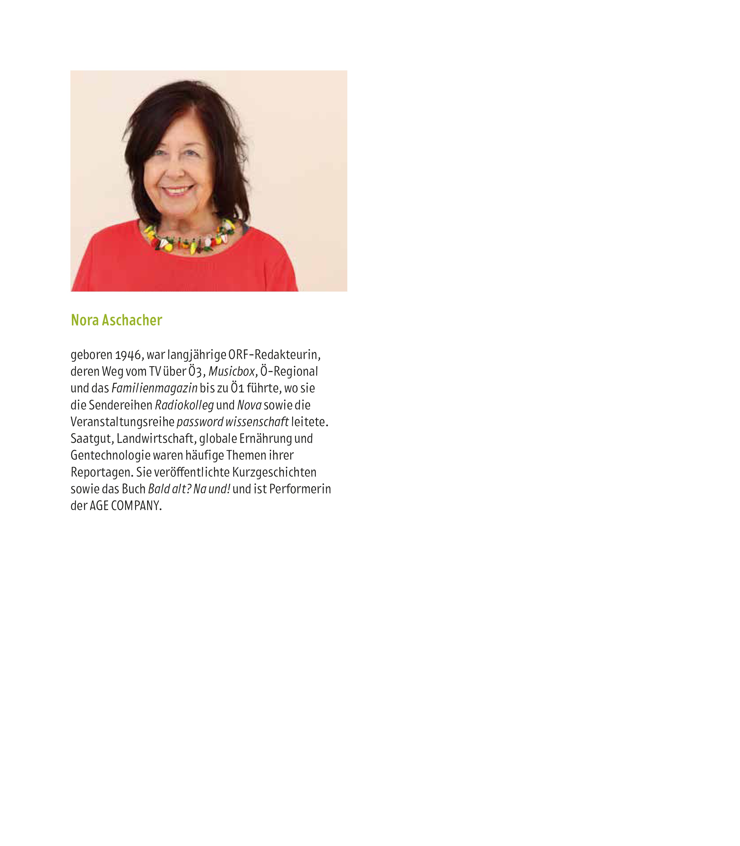 geboren 1946, war langjährige ORF-Redakteurin, deren Weg vom TV über Ö3, „Musicbox“, Ö-Regional und das „Familienmagazin“ bis zu Ö1 führte, wo sie die Sendereihen „Radiokolleg“ und „Nova“ sowie die Veranstaltungsreihe „password wissenschaft“ leitete. Saatgut, Landwirtschaft, globale Ernährung, Gentechnologie waren häufige Themen ihrer Reportagen. Sie veröffentlichte Kurzgeschichten sowie das Buch Bald alt? Na und! und ist Performerin der AGE COMPANY.