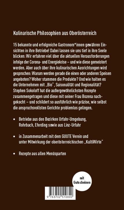 Die Geheimnisse beliebter Köch*innen!Nicht weniger als 15 bekannte und erfolgreiche Gastronom*innen gewähren Einsichten in ihre Betriebe! Dabei lassen sie uns tief in ihre Seele blicken: Wir erfahren viel über die aktuellen Herausforderungen infolge der Corona- und Energiekrise - und wie diese gemeistert werden.Aber auch über ihre kulinarischen Ausrichtungen wird gesprochen: Warum werden gerade die einen oder anderen Speisen angeboten? Woher stammen die Produkte? Und wie halten es die Unternehmen mit "Bio", Saisonalität und Regionalität?Alle vorgestellten Gastronomiebetriebe sind bewusst heimatverbunden, viele sind dazu aber auch besonders innovationsfreudig, kreativ und offen für internationale Einflüsse. Manche Restaurants kochen auf Hauben-Niveau, andere spezialisieren sich auf die "einfache Küche".Stephen Sokoloff hat die außergewöhnlichsten Rezepte zusammengetragen und diese mit seiner Frau Bozena nachgekocht - und schildert so ausführlich wie präzise, wie selbst die anspruchsvollsten Gerichte problemlos gelingen.- Gastronomische und kulinarische Philosophien aus Oberösterreich - Schwerpunkt Urfahr und Umgebung- Rezepte aus allen Menüsparten- In Zusammenarbeit mit dem GUUTE Verein und unter Mitwirkung der oberösterreichischen "KultiWirte"