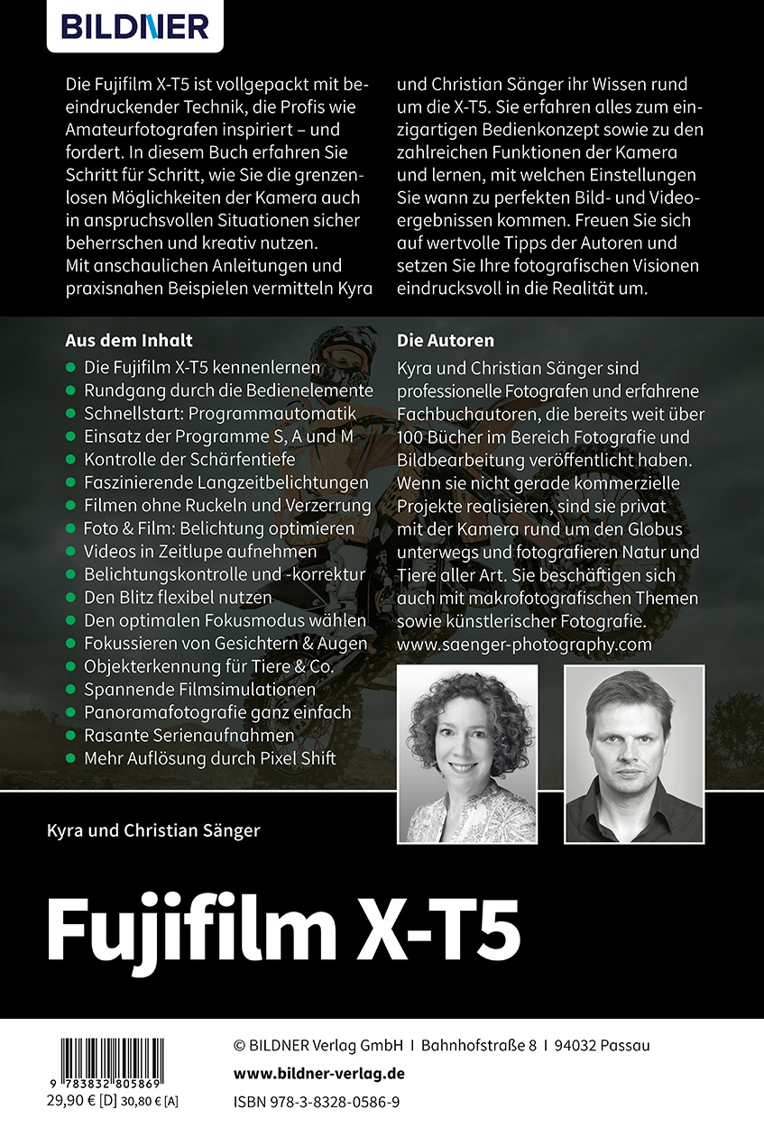 Mit anschaulichen Anleitungen und praxisnahen Beispielen vermitteln Kyra und Christian Sänger ihr Wissen rund um die Fujifilm X-T5. Sie erfahren alles zum einzigartigen Bedienkonzept sowie zu den zahlreichen Funktionen der Kamera und lernen, mit welchen Einstellungen Sie wann zu perfekten Bild- und Videoergebnissen kommen. Freuen Sie sich auf wertvolle Tipps der Autoren und setzen Sie Ihre fotografischen Visionen eindrucksvoll in die Realität um.