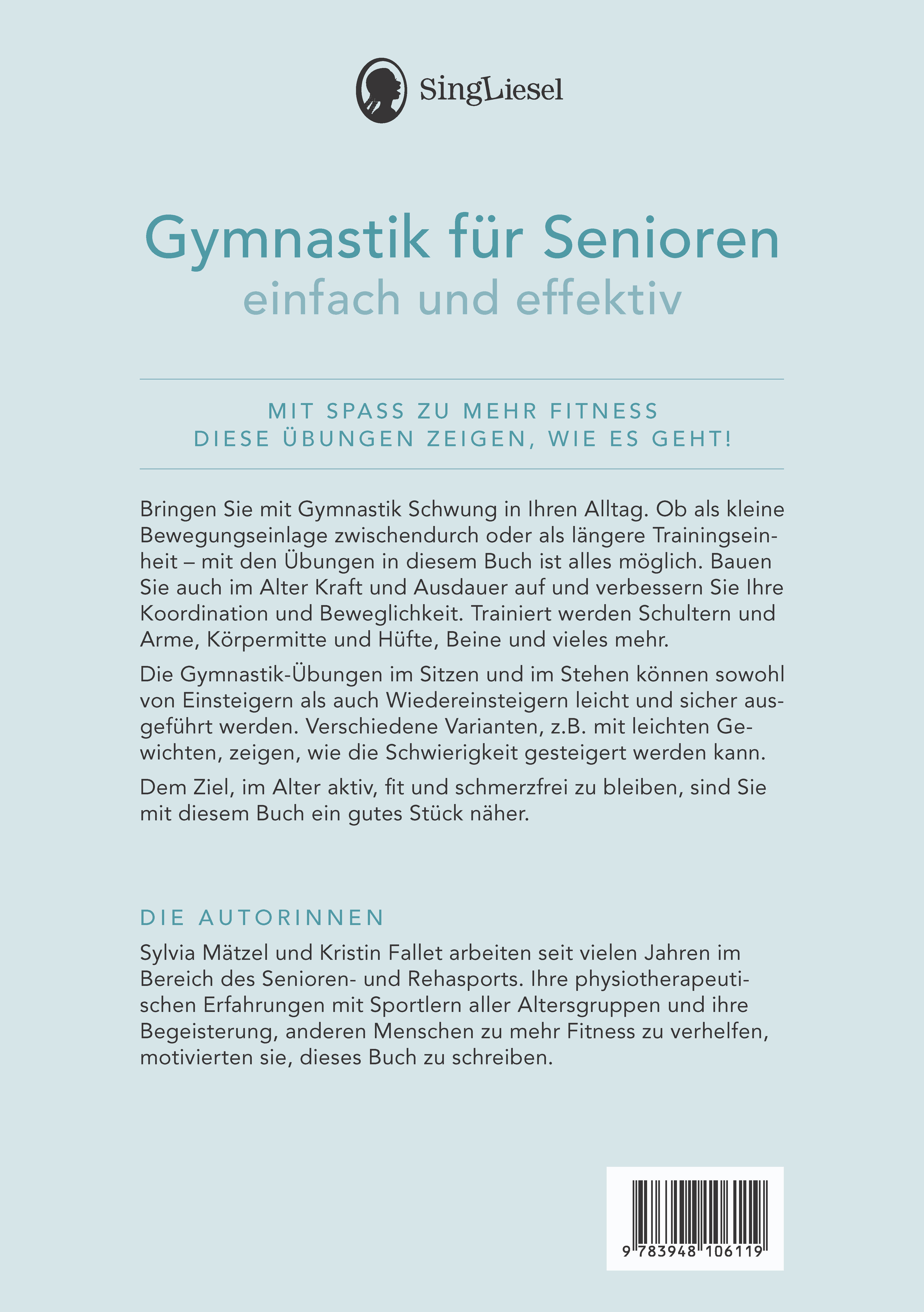 Gymnastik für Senioren - einfach und effektiv!Bringen Sie mit Gymnastik Schwung in Ihren Alltag. Ob als kleine Bewegungseinlage zwischendurch oder als längere Trainingseinheit - mit den Übungen in diesem Buch ist alles möglich. Bauen Sie auch im Alter Kraft und Ausdauer auf und verbessern Sie Ihre Koordination und Beweglichkeit. Trainiert werden Schultern und Arme, Körpermitte und Hüfte, Beine und vieles mehr.Die Gymnastik-Übungen im Sitzen und im Stehen können sowohl von Einsteigern als auch Wiedereinsteigern leicht und sicher ausgeführt werden. Verschiedene Varianten, z.B. mit leichten Gewichten, zeigen, wie die Schwierigkeit gesteigert werden kann.Dem Ziel, im Alter aktiv, fit und schmerzfrei zu bleiben, sind Sie mit diesem Buch ein gutes Stück näher.
