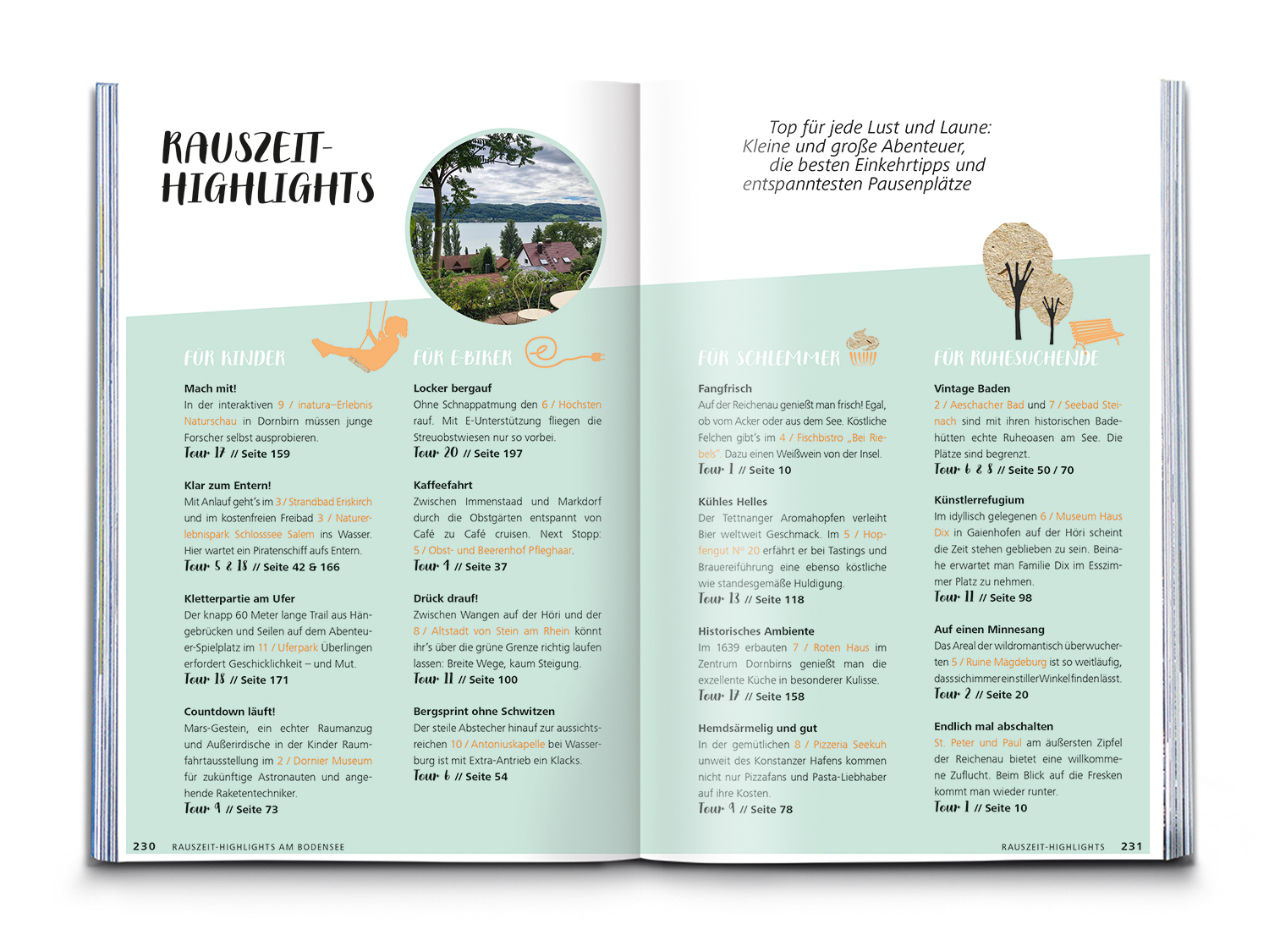 Bei der Tourenauswahl helfen Highlight-Listen für Kinder, E-Biker, Schlemmer und Ruhesuchende. Dank Eventkalender planst du deine Route immer zur besten Zeit und mit Radcheck und Packliste bist du bestens gerüstet fürs Heimat- oder Urlaubsabenteuer. Jede Tour wird ergänzt um Einkehrtipps, Anreiseinfos, Höhenprofil und Tourenkarte. Der Radtourenguide mit Extra-Tourenkarte, App und GPX-Download verbindet Inspiration auf dem Sofa mit einfacher Navigation vor Ort. So entdeckst du den Bodensee neu. Da bleibt nur: aufsatteln und losradeln!