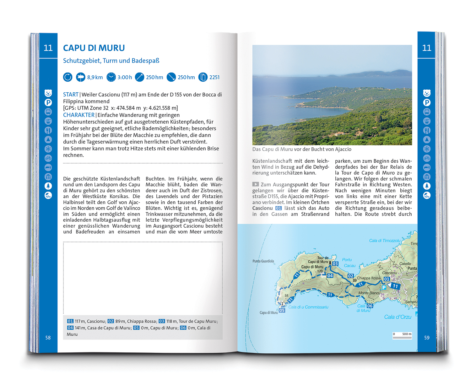 - Beschrieben werden alle klassischen Touren zu den wichtigsten Zielen der Insel, inklusive den höchsten Bergen Monte Cinto, Monte Rotondo und Monte d'Oro. Kurzwanderungen führen zu naturkundlichen Highlights wie den Gumpen von Polischellu, dem Wasserfall Piscia di Gallo, dem Wackelstein Uomo di Cagna oder der Spelunca-Schlucht.