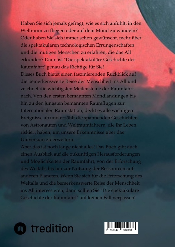 Haben Sie sich jemals gefragt, wie es sich anfühlt, in den Weltraum zu fliegen oder auf dem Mond zu wandeln? Oder haben Sie sich immer schon gewünscht, mehr über die spektakulären technologischen Errungenschaften und die mutigen Menschen zu erfahren, die das All erkunden? Dann ist "Die spektakuläre Geschichte der Raumfahrt" genau das Richtige für Sie!Dieses Buch bietet einen faszinierenden Rückblick auf die bemerkenswerte Reise der Menschheit ins All und zeichnet die wichtigsten Meilensteine der Raumfahrt nach. Von den ersten bemannten Mondlandungen bis hin zu den jüngsten bemannten Raumflügen zur Internationalen Raumstation, deckt es alle wichtigen Ereignisse ab und erzählt die spannenden Geschichten von Astronauten und Weltraumfahrern, die ihr Leben riskiert haben, um unsere Erkenntnisse über das Universum zu erweitern.Aber das ist noch lange nicht alles! Das Buch gibt auch einen Ausblick auf die zukünftigen Herausforderungen und Möglichkeiten der Raumfahrt, von der Erforschung des Weltalls bis hin zur Nutzung der Ressourcen auf anderen Planeten. Wenn Sie sich für die Erforschung des Weltalls und die bemerkenswerte Reise der Menschheit ins All interessieren, dann sollten Sie "Die spektakuläre Geschichte der Raumfahrt" auf keinen Fall verpassen!