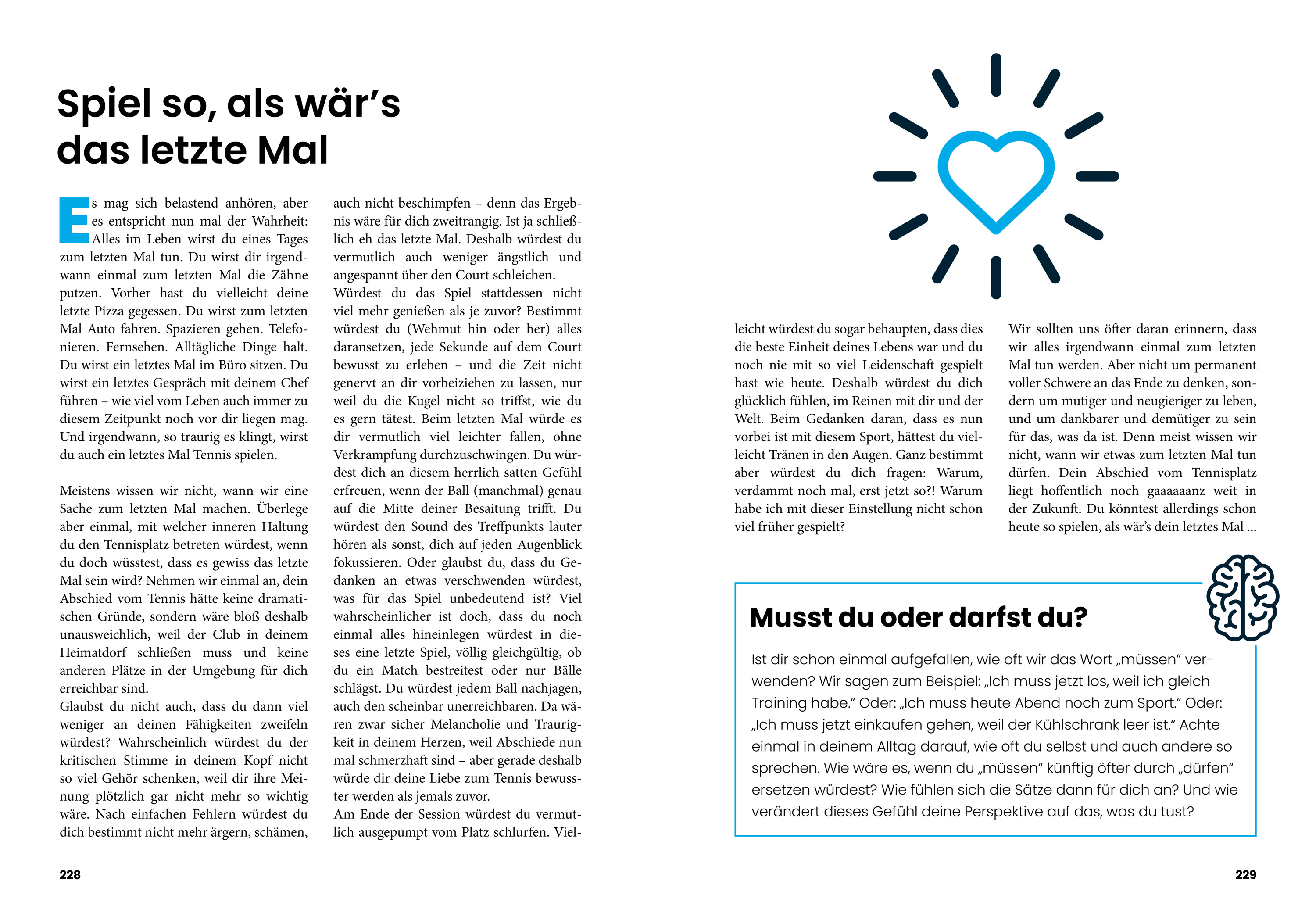 Ein Schmökerwerk voller Inspirationen und Impulse, die das Tennisspiel (und sogar den Rest des Lebens) leichter und noch schöner machen. Ein bunter Mix aus Humor und Tiefgang, persönlichen Anekdoten, Geschichten zum Schmunzeln, Fragen zum Reflektieren und Übungen zum Ausprobieren. Für alle, die diesen Sport lieben und ihn noch mehr genießen wollen.