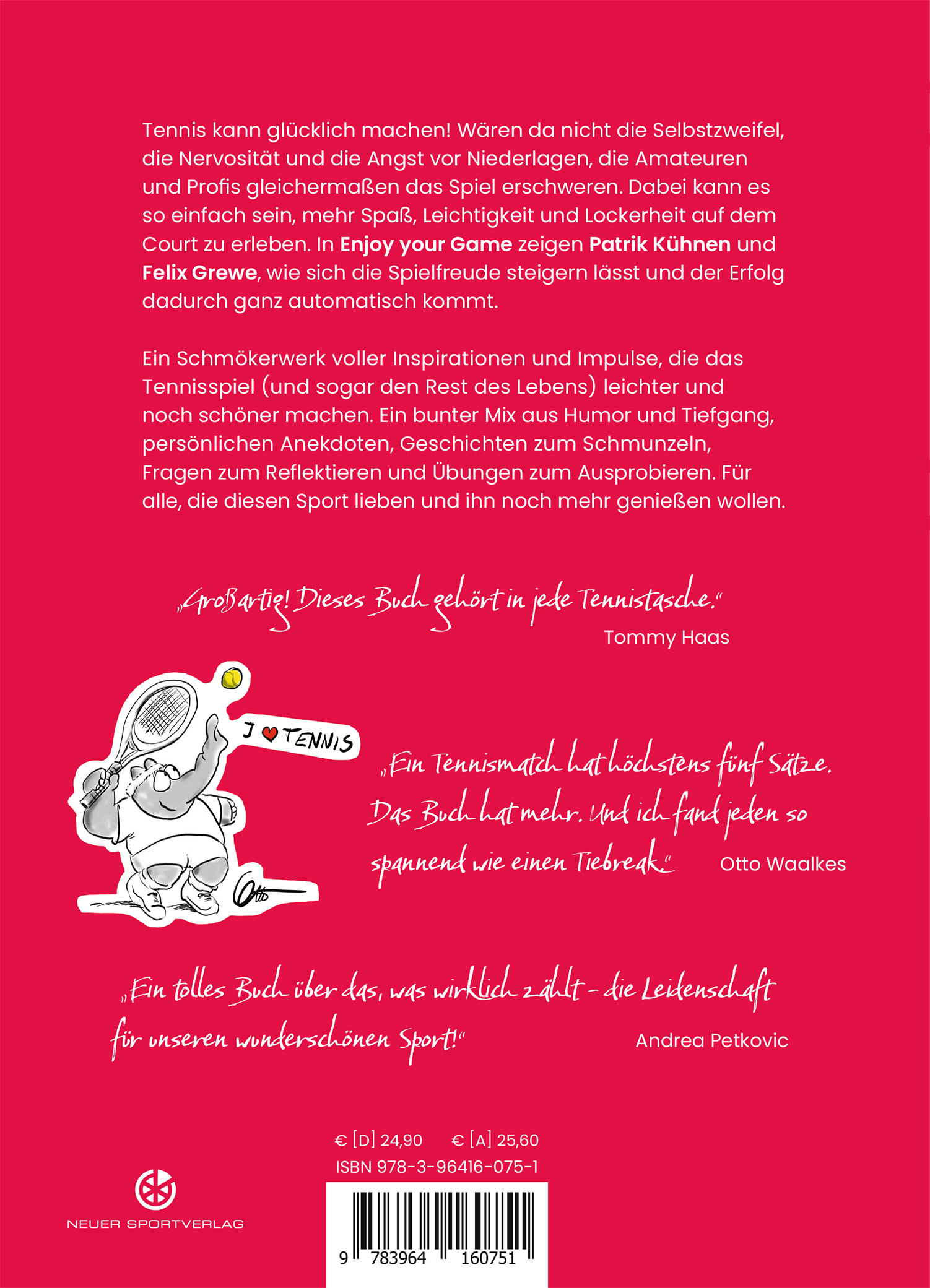 Tennis kann glücklich machen! Wären da nicht die Selbstzweifel, die Nervosität und die Angst vor Niederlagen, die Amateuren und Profis gleichermaßen das Spiel erschweren. Dabei kann es so einfach sein, mehr Spaß, Leichtigkeit und Lockerheit auf dem Court zu erleben. In Enjoy your Game zeigen Patrik Kühnen und Felix Grewe, wie sich die Spielfreude steigern lässt und der Erfolg dadurch ganz automatisch kommt.