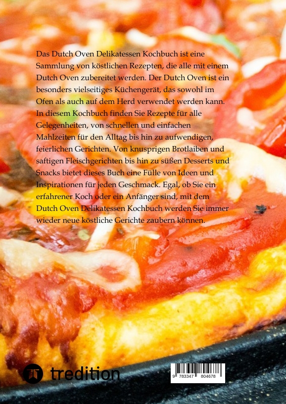 Das Dutch Oven Delikatessen Kochbuch ist eine Sammlung von köstlichen Rezepten, die alle mit einem Dutch Oven zubereitet werden. Der Dutch Oven ist ein besonders vielseitiges Küchengerät, das sowohl im Ofen als auch auf dem Herd verwendet werden kann. In diesem Kochbuch finden Sie Rezepte für alle Gelegenheiten, von schnellen und einfachen Mahlzeiten für den Alltag bis hin zu aufwendigen, feierlichen Gerichten. Von knusprigen Brotlaiben und saftigen Fleischgerichten bis hin zu süßen Desserts und Snacks bietet dieses Buch eine Fülle von Ideen und Inspirationen für jeden Geschmack. Egal, ob Sie ein erfahrener Koch oder ein Anfänger sind, mit dem Dutch Oven Delikatessen Kochbuch werden Sie immer wieder neue köstliche Gerichte zaubern können.