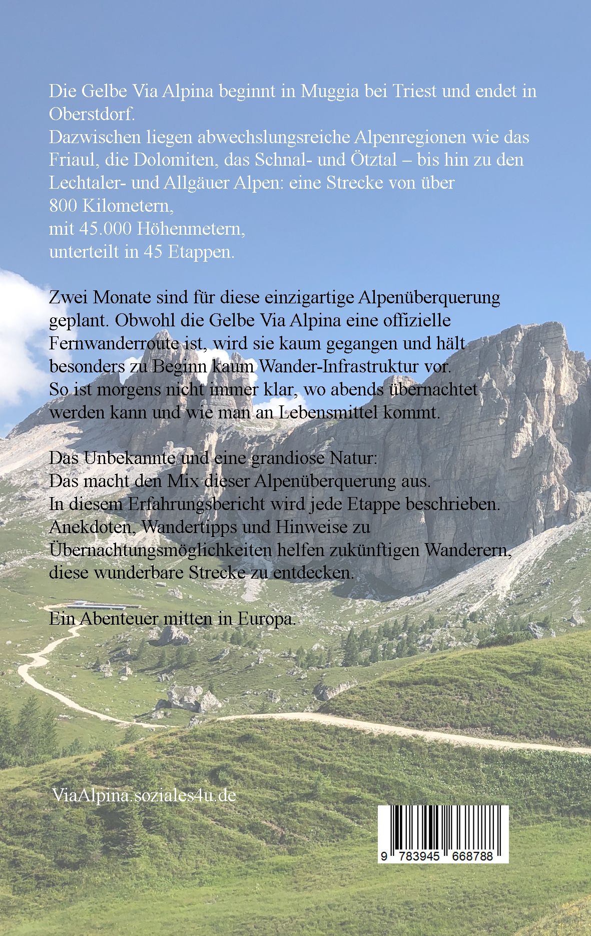 Die Gelbe Via Alpina beginnt in Muggia bei Triest und endet in Oberstdorf. Dazwischen liegen abwechslungsreiche Alpenregionen wie das Friaul, die Dolomiten, das Schnal- und Ötztal – bis hin zu den Lechtaler- und Allgäuer Alpen: eine Strecke von über 800 Kilometern, mit 45.000 Höhenmetern, unterteilt in 45 Etappen.
