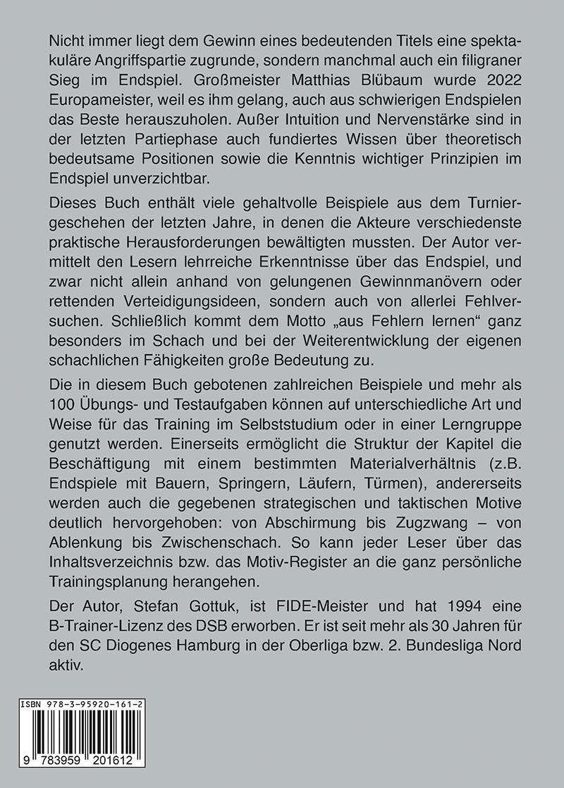 Nicht immer liegt dem Gewinn eines bedeutenden Titels eine spektakuläre Angriffspartie zugrunde, sondern manchmal auch ein filigraner Sieg im Endspiel. Großmeister Matthias Blübaum wurde 2022 Europameister, weil es ihm gelang, auch aus schwierigen Endspielen das Beste herauszuholen. Außer Intuition und Nervenstärke sind in der letzten Partiephase auch fundiertes Wissen über theoretisch bedeutsame Positionen sowie die Kenntnis wichtiger Prinzipien im Endspiel unverzichtbar.Dieses Buch enthält viele gehaltvolle Beispiele aus dem Turnier- geschehen der letzten Jahre, in denen die Akteure verschiedenste praktische Herausforderungen bewältigten mussten. Der Autor vermittelt den Lesern lehrreiche Erkenntnisse über das Endspiel, und zwar nicht allein anhand von gelungenen Gewinnmanövern oder rettenden Verteidigungsideen, sondern auch von allerlei Fehlversuchen. Schließlich kommt dem Motto "aus Fehlern lernen" ganz besonders im Schach und bei der Weiterentwicklung der eigenen schachlichen Fähigkeiten große Bedeutung zu.Die in diesem Buch gebotenen zahlreichen Beispiele und mehr als 100 Übungs- und Testaufgaben können auf unterschiedliche Art und Weise für das Training im Selbststudium oder in einer Lerngruppe genutzt werden. Einerseits ermöglicht die Struktur der Kapitel die Beschäftigung mit einem bestimmten Materialverhältnis (z.B. Endspiele mit Bauern, Springern, Läufern, Türmen), andererseits werden auch die gegebenen strategischen und taktischen Motive deutlich hervorgehoben: von Abschirmung bis Zugzwang - von Ablenkung bis Zwischenschach. So kann jeder Leser über das Inhaltsverzeichnis bzw. das Motiv-Register an die ganz persönliche Trainingsplanung herangehen.Der Autor, Stefan Gottuk, ist FIDE-Meister und hat 1994 eine B-Trainer-Lizenz des DSB erworben. Er ist seit mehr als 30 Jahren für den SC Diogenes Hamburg in der Oberliga bzw. 2. Bundesliga Nord aktiv.