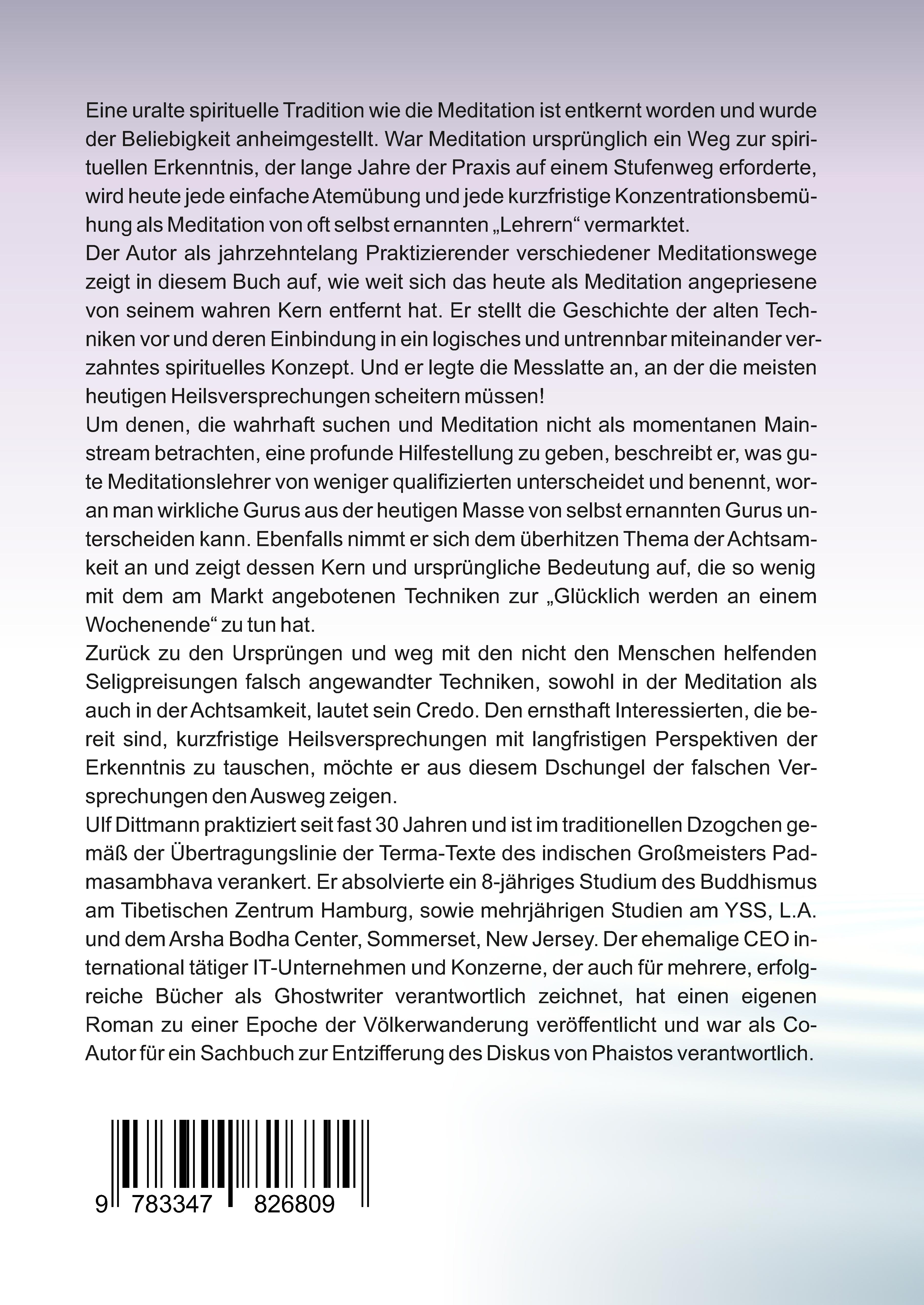 Eine uralte spirituelle Tradition wie die Meditation ist entkernt worden und wurde der Beliebigkeit anheimgestellt. War Meditation ursprünglich ein Weg zur spirituellen Erkenntnis, der lange Jahre der Praxis auf einem Stufenweg erforderte, wird heute jede einfache Atemübung und jede kurzfristige Konzentrationsbemühung als Meditation von oft selbst ernannten "Lehrern" vermarktet. Der Autor als jahrzehntelang Praktizierender verschiedener Meditationswege zeigt in diesem Buch auf, wie weit sich das heute als Meditation angepriesene von seinem wahren Kern entfernt hat. Er stellt die Geschichte der alten Techniken vor und deren Einbindung in ein logisches und untrennbar miteinander verzahntes spirituelles Konzept. Und er legte die Messlatte an, an der die meisten heutigen Heilsversprechungen scheitern müssen! Um denen, die wahrhaft suchen und Meditation nicht als momentanen Mainstream betrachten, eine profunde Hilfestellung zu geben, beschreibt er, was gute Meditationslehrer von weniger qualifizierten unterscheidet und benennt, woran man wirkliche Gurus aus der heutigen Masse von selbst ernannten Gurus unterscheiden kann. Ebenfalls nimmt er sich dem überhitzen Thema der Achtsamkeit an und zeigt dessen Kern und ursprüngliche Bedeutung auf, die so wenig mit dem am Markt angebotenen Techniken zur "Glücklich werden an einem Wochenende" zu tun hat. Zurück zu den Ursprüngen und weg mit den nicht den Menschen helfenden Seligpreisungen falsch angewandter Techniken, sowohl in der Meditation als auch in der Achtsamkeit, lautet sein Credo. Den ernsthaft Interessierten, die bereit sind, kurzfristige Heilsversprechungen mit langfristigen Perspektiven der Erkenntnis zu tauschen, möchte er aus diesem Dschungel der falschen Versprechungen den Ausweg zeigen. Ulf Dittmann praktiziert seit fast 30 Jahren und ist im traditionellen Dzogchen gemäß der Übertragungslinie der Terma-Texte des indischen Großmeisters Padmasambhava verankert. Er absolvierte ein 8-jähriges Studium des Buddhismus am Tibetischen Zentrum Hamburg, sowie mehrjährigen Studien am YSS, L.A. und dem Arsha Bodha Center, Sommerset, New Jersey. Der ehemalige CEO international tätiger IT-Unternehmen und Konzerne, der auch für mehrere, erfolgreiche Bücher als Ghostwriter verantwortlich zeichnet, hat einen eigenen Roman zu einer Epoche der Völkerwanderung veröffentlicht und war als Co-Autor für ein Sachbuch zur Entzifferung des Diskus von Phaistos verantwortlich.
