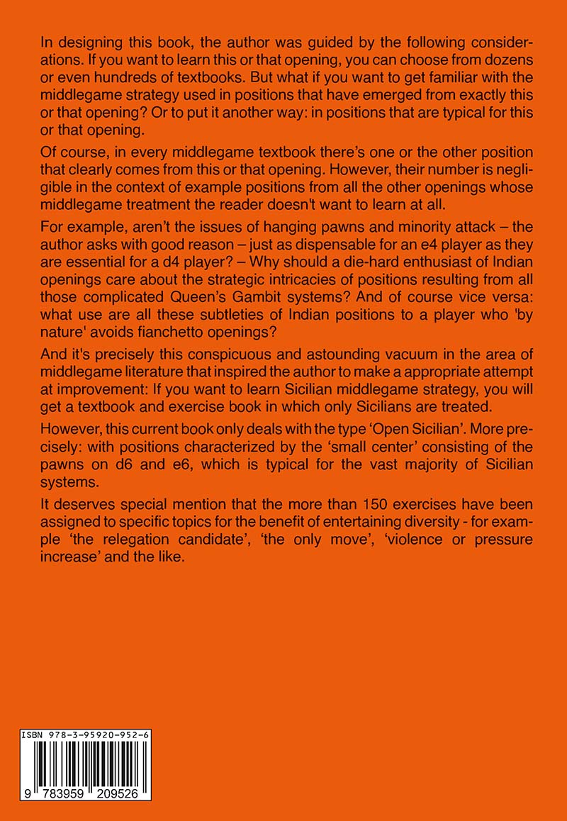 In designing this book, the author was guided by the following considerations. If you want to learn this or that opening, you can choose from dozens or even hundreds of textbooks. But what if you want to get familiar with the middlegame strategy used in positions that have emerged from exactly this or that opening? Or to put it another way: in positions that are typical for this or that opening.Of course, in every middlegame textbook there's one or the other position that clearly comes from this or that opening. However, their number is negligible in the context of example positions from all the other openings whose middlegame treatment the reader doesn't want to learn at all.For example, aren't the issues of hanging pawns and minority attack - the author asks with good reason - just as dispensable for an e4 player as they are essential for a d4 player? - Why should a die-hard enthusiast of Indian openings care about the strategic intricacies of positions resulting from all those complicated Queen's Gambit systems? And of course vice versa: what use are all these subtleties of Indian positions to a player who 'by nature' avoids fianchetto openings?And it's precisely this conspicuous and astounding vacuum in the area of middlegame literature that inspired the author to make a appropriate attempt at improvement: If you want to learn Sicilian middlegame strategy, you will get a textbook and exercise book in which only Sicilians are treated.However, this current book only deals with the type 'Open Sicilian'. More precisely: with positions characterized by the 'small center' consisting of the pawns on d6 and e6, which is typical for the vast majority of Sicilian systems.It deserves special mention that the more than 150 exercises have been assigned to specific topics for the benefit of entertaining diversity - for example 'the relegation candidate', 'the only move', 'violence or pressure increase' and the like.
