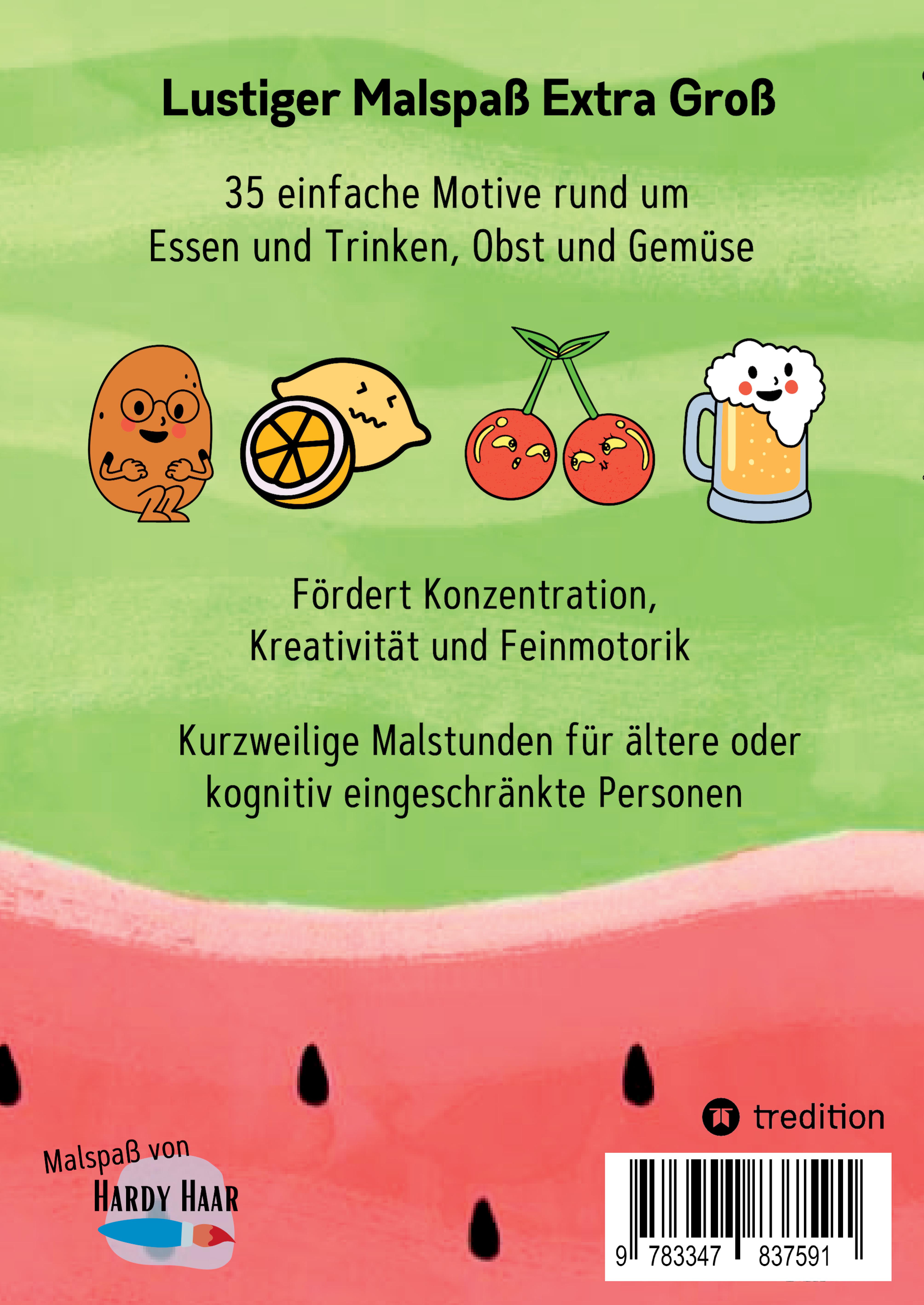 Ein lustiges Großdruck Malbuch für Senioren, Rentner, Sehbehinderte, Seniorenbetreuung und Malgruppen. 35 einfache Motive rund um Essen und Trinken, Obst und Gemüse. Mit dicken Linien, großen Motiven und einer einfachen Gehirntraining-Übung. Fördert Konzentration, Kreativität und Feinmotorik. Kurzweilige Malstunden für ältere oder kognitiv eingeschränkte Personen. Hohe Qualität mit dickem Papier.