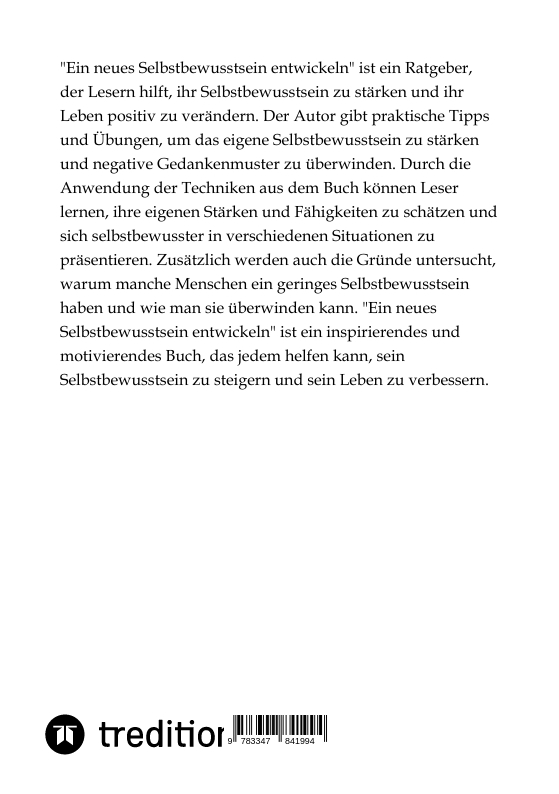 "Ein neues Selbstbewusstsein entwickeln" ist ein Ratgeber, der Lesern hilft, ihr Selbstbewusstsein zu stärken und ihr Leben positiv zu verändern. Der Autor gibt praktische Tipps und Übungen, um das eigene Selbstbewusstsein zu stärken und negative Gedankenmuster zu überwinden. Durch die Anwendung der Techniken aus dem Buch können Leser lernen, ihre eigenen Stärken und Fähigkeiten zu schätzen und sich selbstbewusster in verschiedenen Situationen zu präsentieren. Zusätzlich werden auch die Gründe untersucht, warum manche Menschen ein geringes Selbstbewusstsein haben und wie man sie überwinden kann. "Ein neues Selbstbewusstsein entwickeln" ist ein inspirierendes und motivierendes Buch, das jedem helfen kann, sein Selbstbewusstsein zu steigern und sein Leben zu verbessern.
