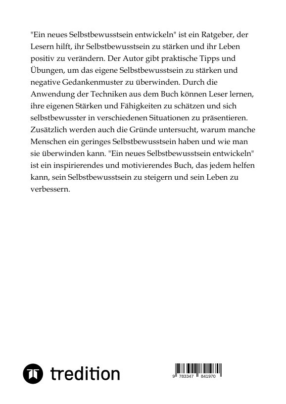 "Ein neues Selbstbewusstsein entwickeln" ist ein Ratgeber, der Lesern hilft, ihr Selbstbewusstsein zu stärken und ihr Leben positiv zu verändern. Der Autor gibt praktische Tipps und Übungen, um das eigene Selbstbewusstsein zu stärken und negative Gedankenmuster zu überwinden. Durch die Anwendung der Techniken aus dem Buch können Leser lernen, ihre eigenen Stärken und Fähigkeiten zu schätzen und sich selbstbewusster in verschiedenen Situationen zu präsentieren. Zusätzlich werden auch die Gründe untersucht, warum manche Menschen ein geringes Selbstbewusstsein haben und wie man sie überwinden kann. "Ein neues Selbstbewusstsein entwickeln" ist ein inspirierendes und motivierendes Buch, das jedem helfen kann, sein Selbstbewusstsein zu steigern und sein Leben zu verbessern.