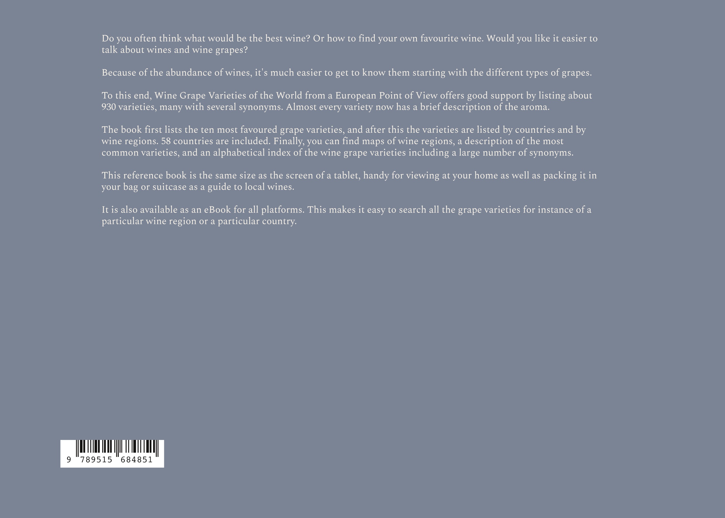 Do you often think what would be the best wine? Or how to find your own favourite wine. Would you like it easier to talk about wines and wine grapes?Because of the abundance of wines, it's much easier to get to know them starting with the different types of grapes.To this end, Wine Grape Varieties of the World from a European Point of View offers good support by listing about 930 varieties, many with several synonyms. Almost every variety now has a brief description of the aroma.The book first lists the ten most favoured grape varieties, and after this the varieties are listed by countries and by wine regions. 58 countries are included. Finally, you can find maps of wine regions, a description of the most common varieties, and an alphabetical index of the wine grape varieties including a large number of synonyms.This reference book is the same size as the screen of a tablet, handy for viewing at your home as well as packing it in your bag or suitcase as a guide to local wines.It is also available as an eBook for all platforms. This makes it easy to search all the grape varieties for instance of a particular wine region or a particular country.The book can be previewed before a possible decision to buy it e.g. by clicking the following find your favourite wine link.https://sites.google.com/view/find-your-favourite-wine/The link also gives you useful guidance, if you decide to buy it.If the link is not active, you can paint it. Then, click the right mouse button and choose Move to the address.Or, you can paint the link and copy and paste it to the address field of your browser.