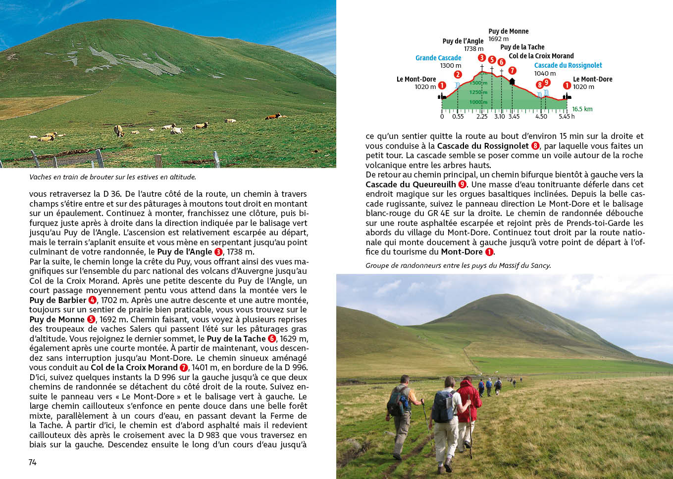 L’Auvergne avec le Massif Central forme le cœur sauvage et verdoyant de la France. A l’écart des masses touristiques et des autoroutes, cette région de moyenne montagne, dans laquelle trois grands parcs naturels ont déjà été aménagés, a su conserver son caractère original. Au nord, les cônes de volcans éteints des monts Dôme et des monts Dore s’alignent en formant de douces collines, au sud, le massif volcanique du Cantal forme les plus grandes éminences. Depuis Le Puy-en-Velay, le chemin populaire de Saint-Jacques traverse le sud du Massif Central, région variée et charmante, passe par les hauts plateaux impraticables et déserts de la Margeride et du massif de l’Aubrac ainsi que le long de la belle vallée du Lot vers les Pyrénées. Blottis dans ce magnifique paysage, des forteresses, des châteaux, des monastères, des églises romanes et de petites cités médiévales bordent les chemins de randonnée. Le long des chemins de grande randonnée notamment, le Massif Central est pourvu d’un réseau dense de gîtes et d’hébergements rustiques. Un grand nombre de randonnées d’une une journée et de petits circuits traversent également cette région de randonnée dans les vallées ainsi que sur les hauts plateaux et les sommets d’altitude. Bettina Forst, qui parcourt depuis des années le Massif Central en tant que guide de randonnée, a rassemblé un éventail varié de promenades simples, de randonnées longues, de circuits vers de superbes sommets et d’impressionnantes randonnées de crête pour les randonneurs moyennement entraînés ainsi que pour les familles avec des enfants. Un bref descriptif de la randonnée avec tous les renseignements importants, une carte en couleurs et une description précise de l’itinéraire pour chaque excursion facilitent le choix et l’orientation sur place. Grâce aux renseignements qu’il donne sur les possibilités de restauration, les variantes et les sites à voir, ce guide sera un accompagnateur idéal à travers ce pays de volcans.