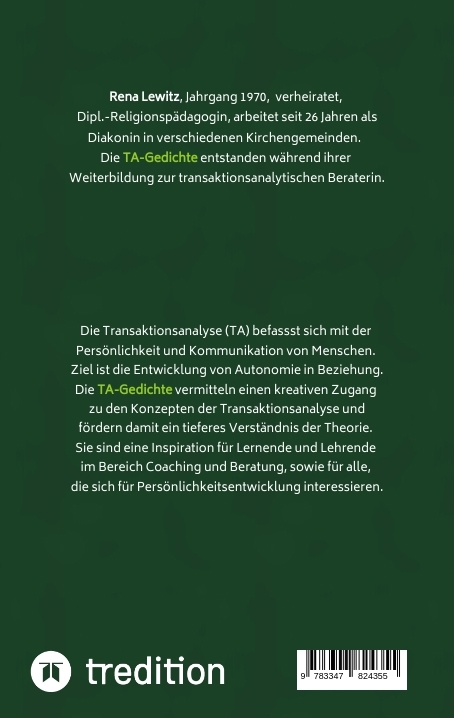 Die Transaktionsanalyse (TA) entstammt der Humanistischen Psychologie und befassst sich mit der Persönlichkeit und Kommunikation von Menschen. Ziel ist die Entwicklung von Autonomie in Beziehung. Die TA-Gedichte vermitteln einen kreativen Zugang zu den Konzepten der Transaktionsanalyse und fördern mit Leichtigkeit ein tieferes Verständnis der Theorie. Sie sind eine Inspiration für Lernende und Lehrende im Bereich Coaching und Beratung, sowie für alle, die sich für Persönlichkeitsentwicklung interessieren.