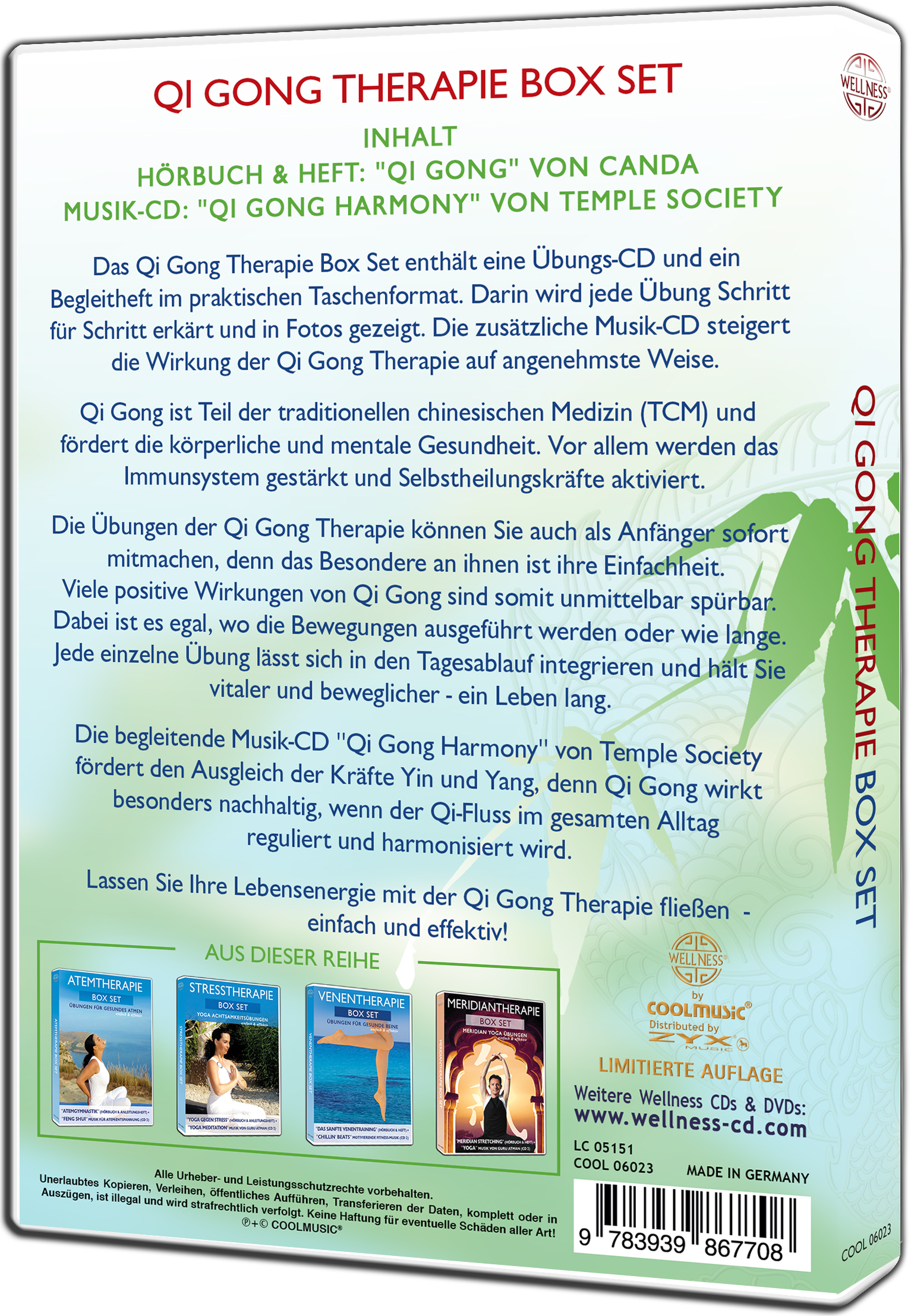 Das Qi Gong Therapie Box Set enthält die Anleitungs-CD "Qi Gong - Einfaches Entspannen durch sanften Energiefluss" von Canda und ein farbiges Begleitheft im praktischen Taschenformat sowie die Qi Gong Musik-CD "Qi Gong Harmony" von Temple Society.