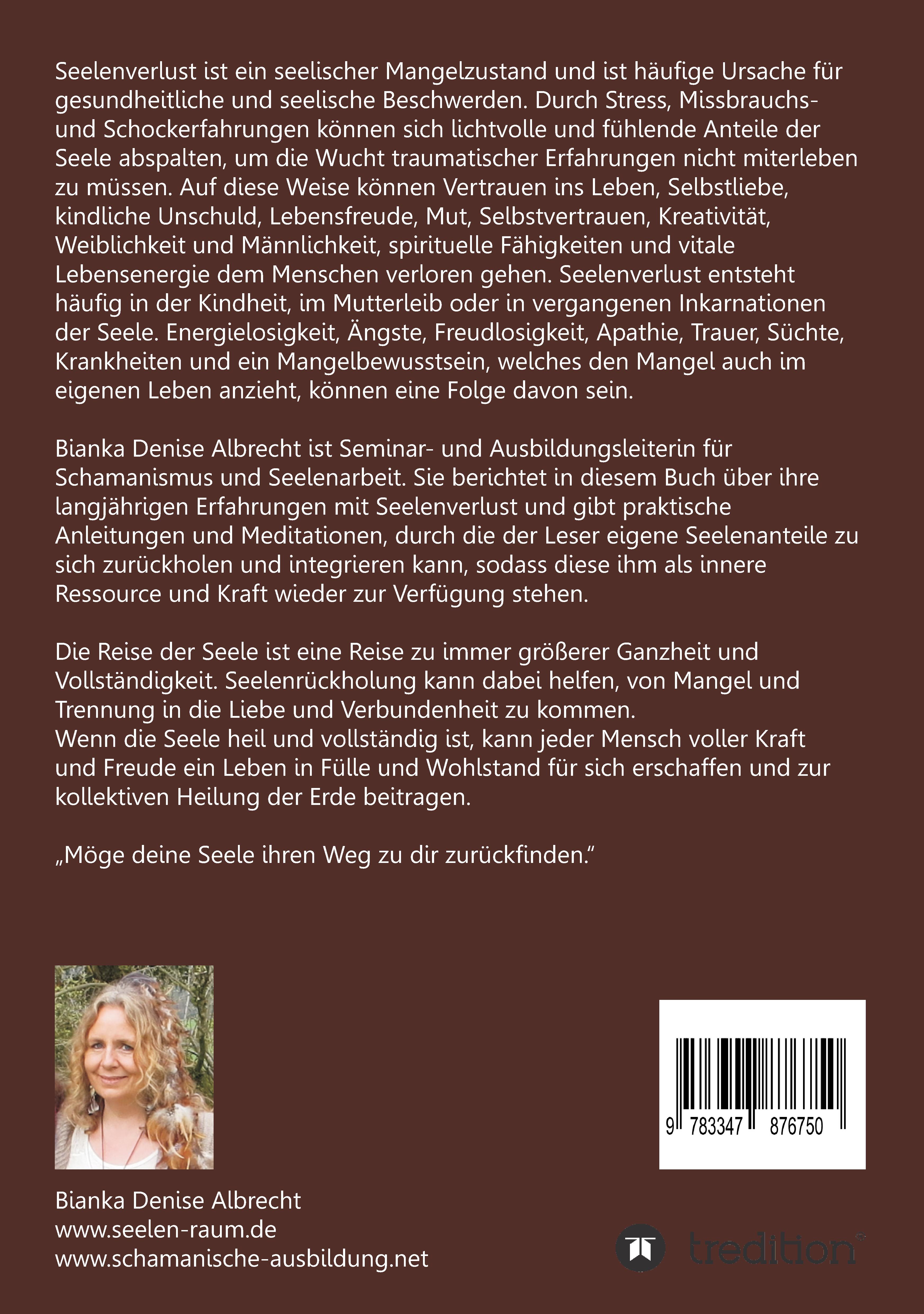Bianka Denise Albrecht sammelte ihre Lebenserfahrung durch unterschiedliche Tätigkeiten im In- und Ausland. Nach einer tiefgreifenden persönlichen Krise erlebte sie ein inneres Erwachen und fand die Verbindung zu ihrer Seele. Diese Erfahrung veränderte ihre Wahrnehmung und ihre Gefühle für sich selbst, für andere und für das Leben dauerhaft. Es ist seitdem ihr Weg und ihre Berufung, andere Menschen auf dem Weg ihrer Seele zu begleiten, um Selbstliebe, Freude, Verbundenheit und Vertrauen zu erfahren und das Leben aktiv selbst zu gestalten. Gemeinsam mit ihrem Mann Ralf Albrecht leitet sie Seminare und Ausbildungen in Schamanismus, Clearingarbeit, Rückführungen und Seelenarbeit. Auf ihrer Homepage: www.seelen-raum.de oder www.schamanische-ausbildung.com können Sie sich über ihre Arbeit und ihr Seminarangebot informieren.