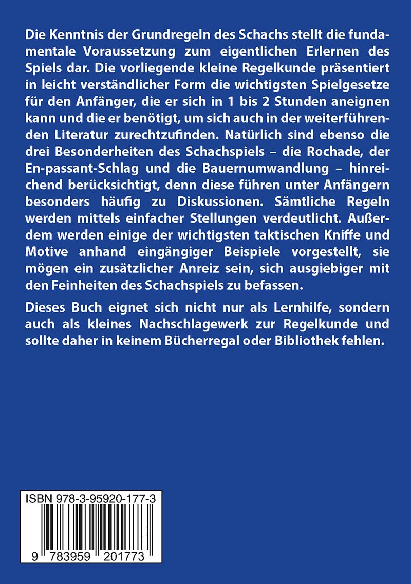 | Schlagworte | Abzugschach • Bauernumwandlung • Bedienungsanleitung Schach • Einführung • en passant • Fesselung • Gangart Schach • grosse Rochade • kleine Rochade • Kurze Rochade • lange Rochade • matt • Patt • Regelkunde • Regeln Schach • Regelwerk • Regelwerk Schach • REMIS • Rochade • Schach • Schachbestseller • Schachbuch • Schachkurs • Schachlehrbuch • Schach lernen • Schachnotation • Schachregeln • Schachspiel • Spieß • Springergabel |