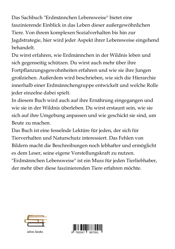 Das Sachbuch "Erdmännchen Lebensweise" bietet eine faszinierende Einblick in das Leben dieser außergewöhnlichen Tiere. Von ihrem komplexen Sozialverhalten bis hin zur Jagdstrategie, hier wird jeder Aspekt ihrer Lebensweise eingehend behandelt.Du wirst erfahren, wie Erdmännchen in der Wildnis leben und sich gegenseitig schützen. Du wirst auch mehr über ihre Fortpflanzungsgewohnheiten erfahren und wie sie ihre Jungen großziehen. Außerdem wird beschrieben, wie sich die Hierarchie innerhalb einer Erdmännchengruppe entwickelt und welche Rolle jeder einzelne dabei spielt.In diesem Buch wird auch auf ihre Ernährung eingegangen und wie sie in der Wildnis überleben. Du wirst erstaunt sein, wie sie sich auf ihre Umgebung anpassen und wie geschickt sie sind, um Beute zu machen.Das Buch ist eine fesselnde Lektüre für jeden, der sich für Tierverhalten und Naturschutz interessiert. Das Fehlen von Bildern macht die Beschreibungen noch lebhafter und ermöglicht es dem Leser, seine eigene Vorstellungskraft zu nutzen. "Erdmännchen Lebensweise" ist ein Muss für jeden Tierliebhaber, der mehr über diese faszinierenden Tiere erfahren möchte.