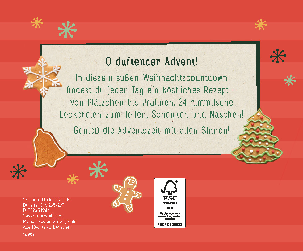 Der praktische Aufstellkalender lässt sich beim Backen einfach auf die Arbeitsplatte stellen und bietet auf jedem Kalenderblatt vorne das Rezeptfoto und auf der Rückseite das Rezept zum Nachbacken.