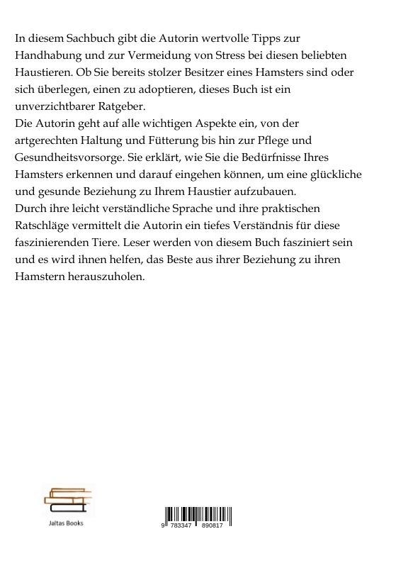 In diesem Sachbuch gibt die Autorin wertvolle Tipps zur Handhabung und zur Vermeidung von Stress bei diesen beliebten Haustieren. Ob Sie bereits stolzer Besitzer eines Hamsters sind oder sich überlegen, einen zu adoptieren, dieses Buch ist ein unverzichtbarer Ratgeber.Die Autorin geht auf alle wichtigen Aspekte ein, von der artgerechten Haltung und Fütterung bis hin zur Pflege und Gesundheitsvorsorge. Sie erklärt, wie Sie die Bedürfnisse Ihres Hamsters erkennen und darauf eingehen können, um eine glückliche und gesunde Beziehung zu Ihrem Haustier aufzubauen.Durch ihre leicht verständliche Sprache und ihre praktischen Ratschläge vermittelt die Autorin ein tiefes Verständnis für diese faszinierenden Tiere. Leser werden von diesem Buch fasziniert sein und es wird ihnen helfen, das Beste aus ihrer Beziehung zu ihren Hamstern herauszuholen.